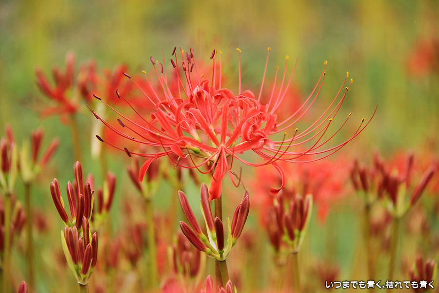 一年は早いもので、今年も彼岸花の季節になりました。毎週逢妻女川の彼岸花の開花状況が気になって見に来ています。先週までは緑一面だったのが、今週は赤い絨毯が見えてきました。土手が真っ赤になるのもあと少しです。蕾が多い中の彼岸花も今週だけの景色です。
