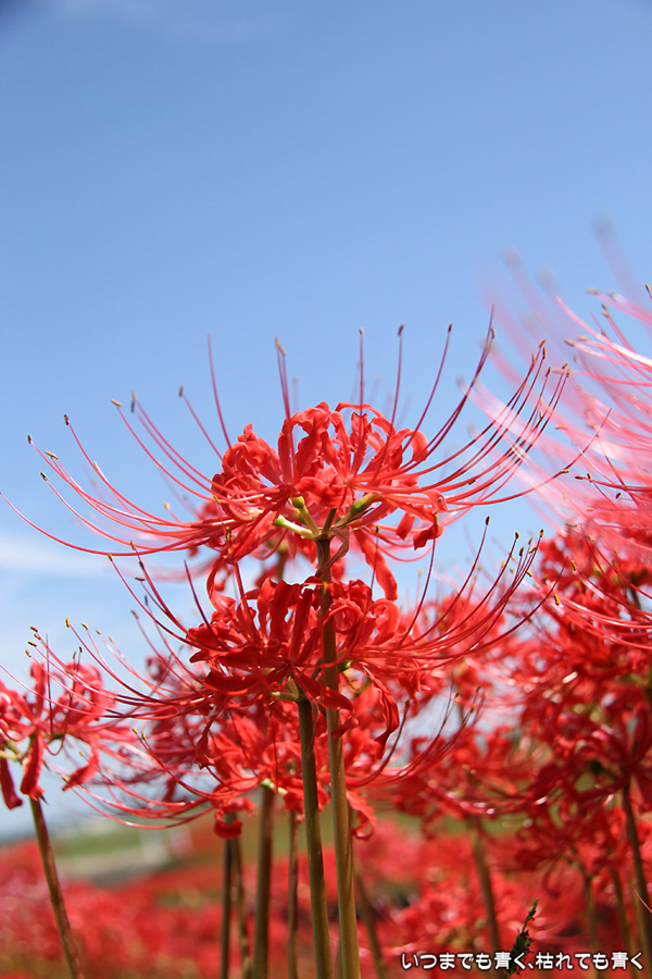 曇り空の昨日と違い今日は快晴だったので、今日も逢妻女川の彼岸花を見に行ってきました。青い空と真っ赤な彼岸花、よく似合います。