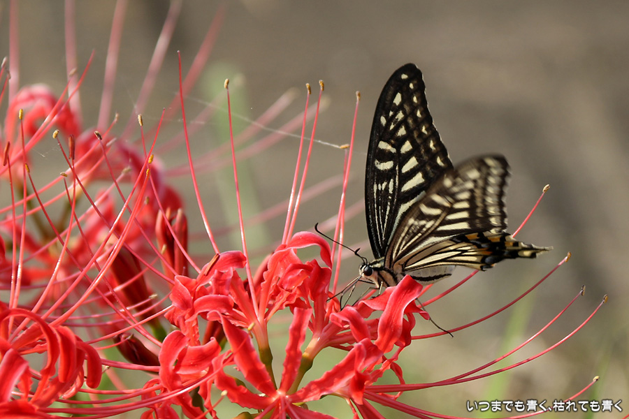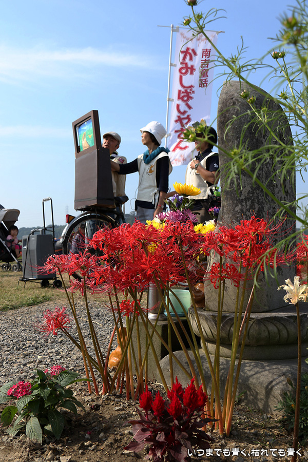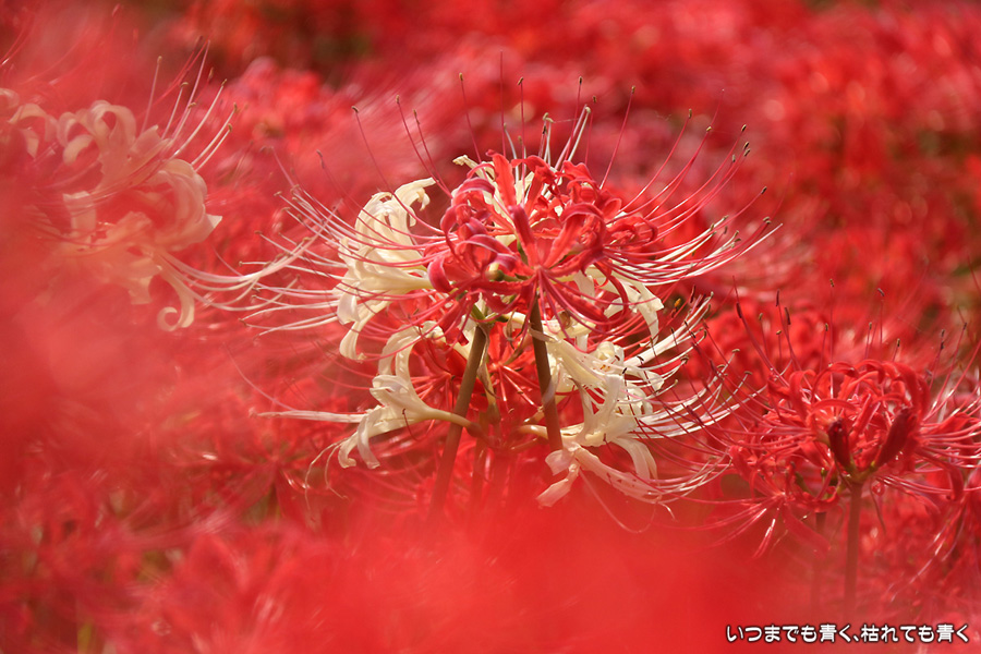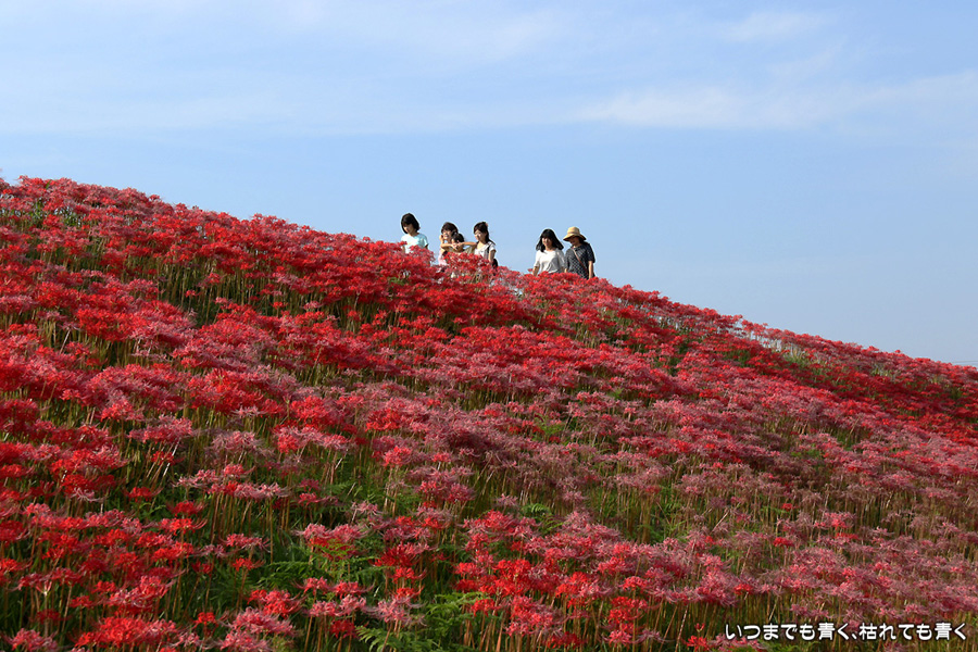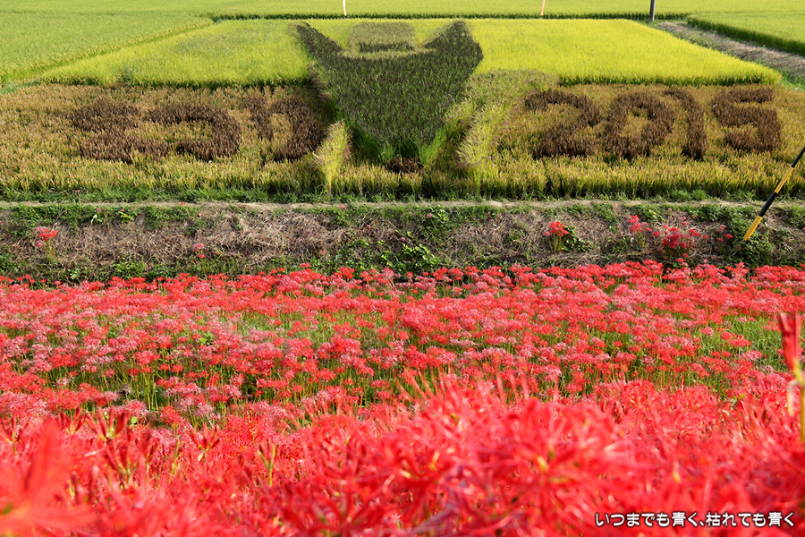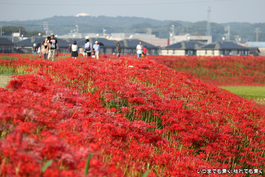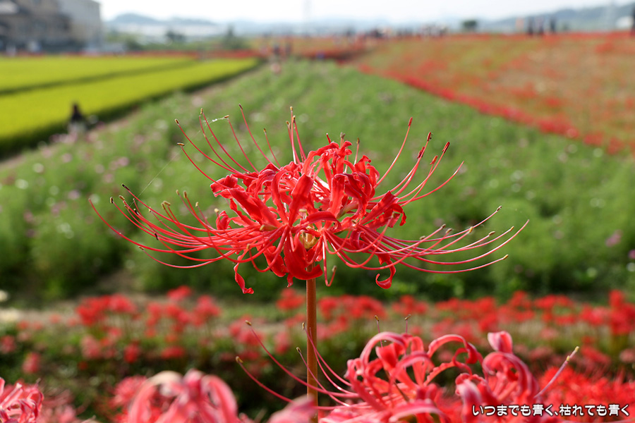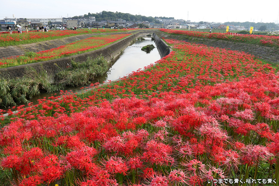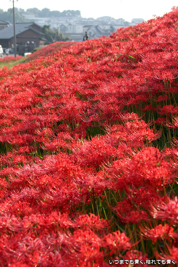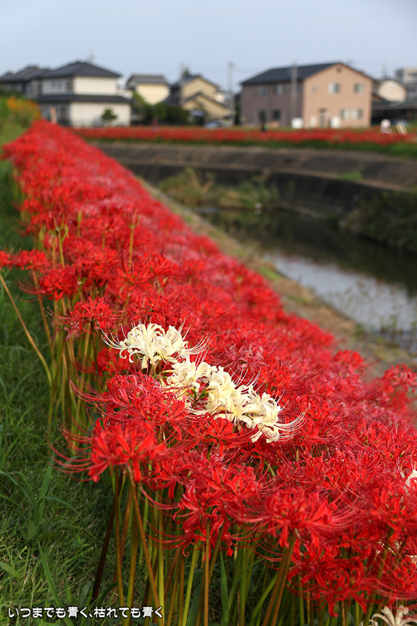 初めて半田市の矢勝川の彼岸花を見てきました。イチゴ狩りのマリモファームさんの臨時駐車場にクルマを止めて、矢勝川の彼岸花西端から東に向かって川の南側堤の道を歩き、戻りは川の北側堤の道を戻ってくるというルートで散策しました。豊田市の逢妻女川の彼岸花とはまったく規模が違いますね。逢妻女川の彼岸花は、群生の中に入るマナーの悪い人たちが目につくようになり、今年は行く気が失せていたのですが、矢勝川の彼岸花を見てしまうとこれからは毎年ここに来てしまいそうです。ここでも、彼岸花の群生にはいったり、コスモスの花畑の中に入り込んで写真を撮っている人がいないわけではないのですけど、逢妻女川のように踏み倒すということは無いようです。このあたりは童話作家の新美南吉の里で、矢勝川は、童話「ごんぎつね」で兵十が魚を獲っていてごんがうなぎを盗んだ川です。ごんの橋やごんぎつね注意の交通標識があったりして思わずごんの悲しい最後を思い出してしまいます。近くには新美南吉記念館があるのですが、今回は行くことができませんでしたのでまたあらためて来てみたいと思います。矢勝川の彼岸花咲く川岸は、西端の弘法橋から東端の高田橋まで片道約2kmもあるそうです。往復で4kmにもなり、14時頃から見始めたのですが、写真を撮りながらのんびりと歩いていたら駐車場に戻ってきたのは17時目前でした。でも、さわやかな風が流れ、汗だくになることもなく気持ち良く良い運動ができたかなと思います。暑い八月の夏からたった一ヶ月。こうして彼岸花が咲き、ススキが揺れて稲穂が実る、もう完全に秋ですね。紅葉がもうすぐです。