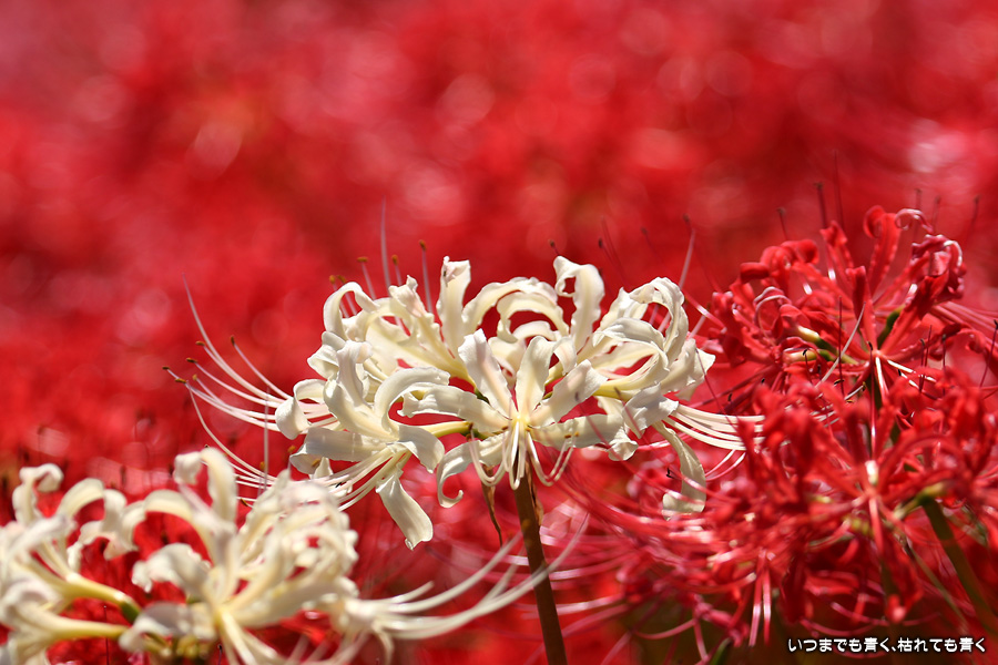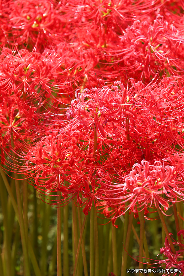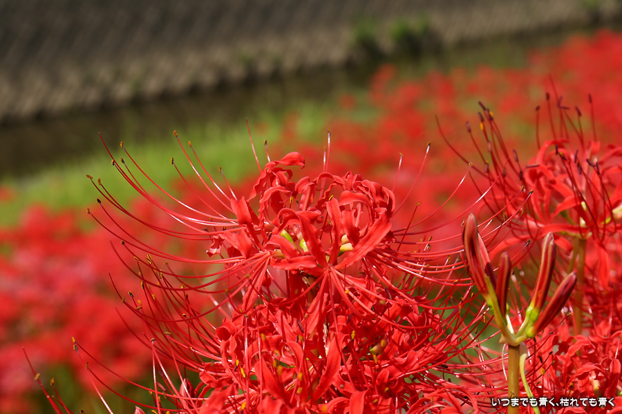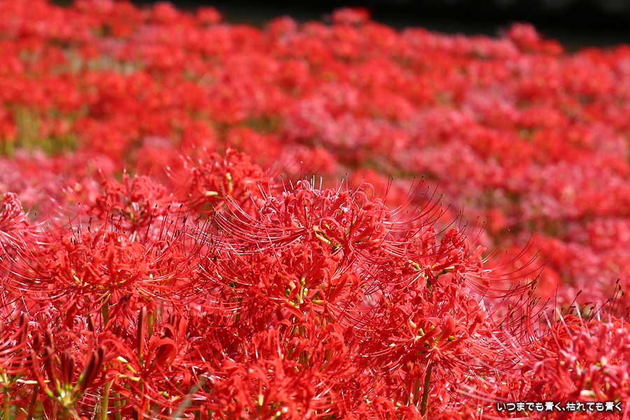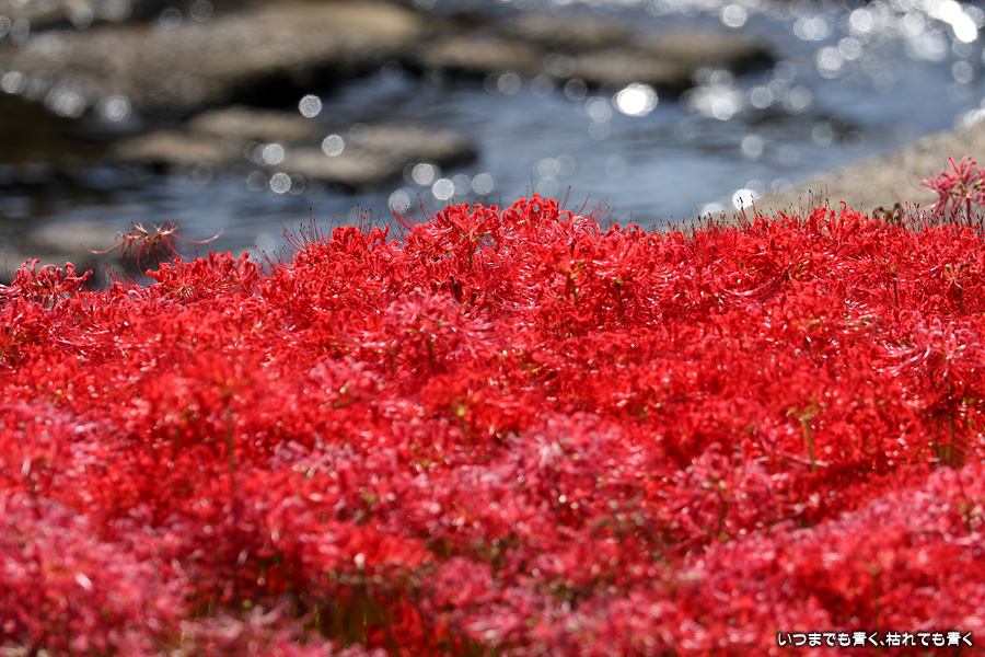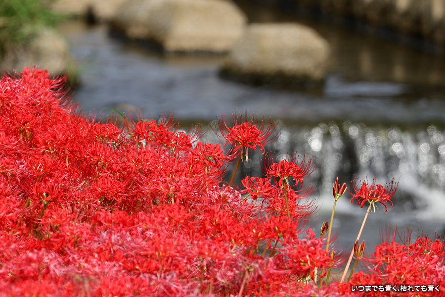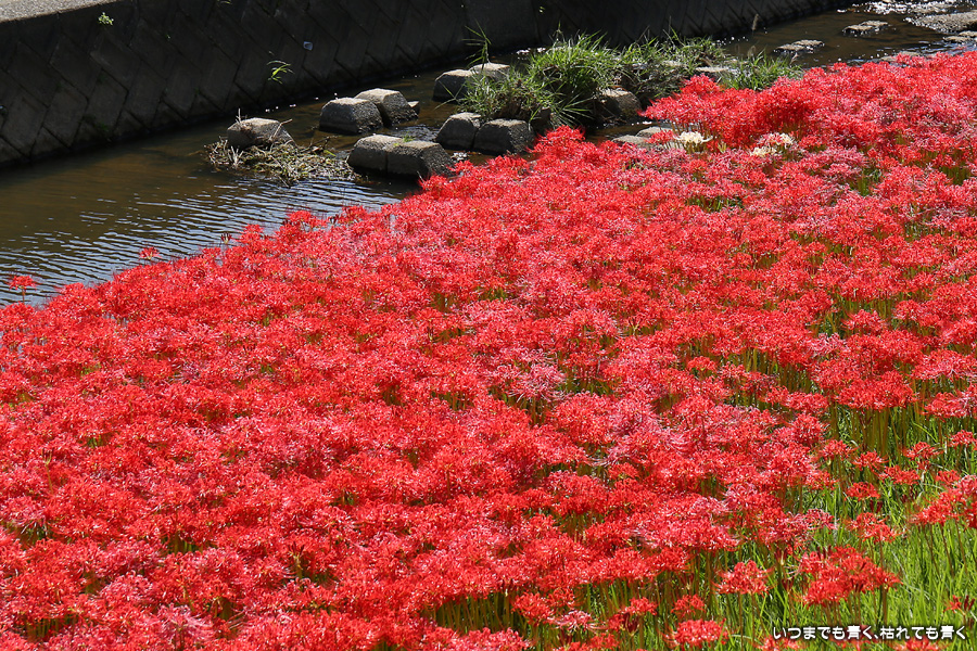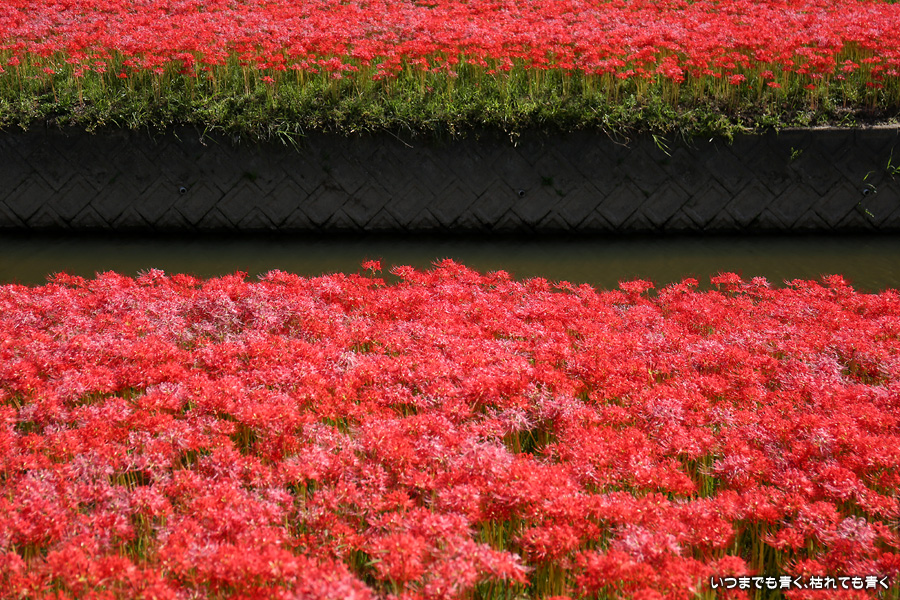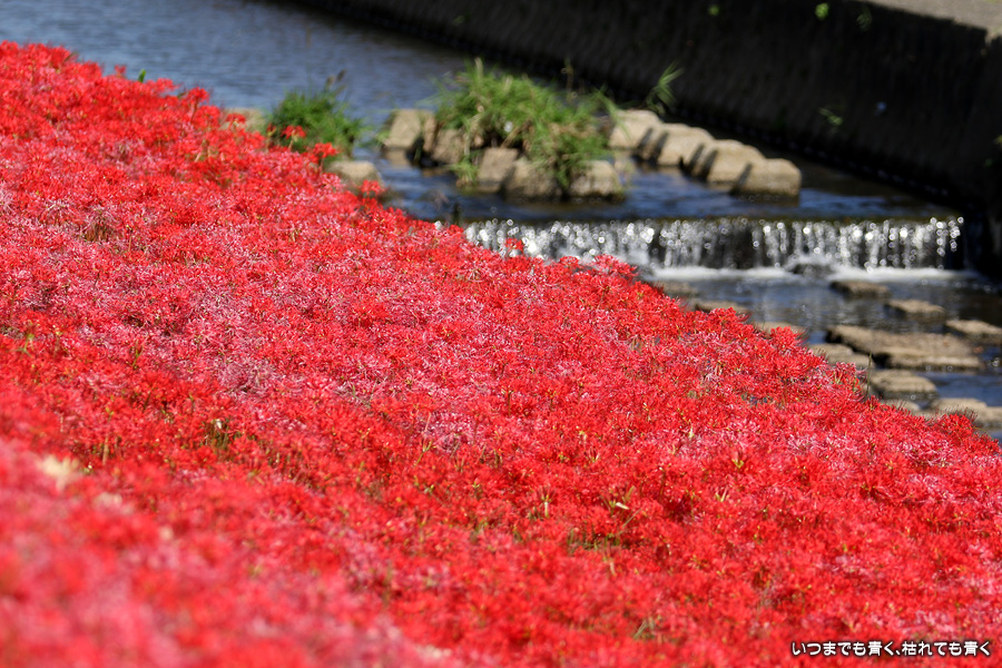 今年の彼岸花は暑さのせいで咲きがよくないのかなと思ってあきらめていましたが、天気が良くて気持ちの良い風が吹いていましたので、もういちど近くの逢妻女川の彼岸花を見に行ってきました。一週間前の9月25日に訪れた時は、斜面にはまったく彼岸花が無かったのですが、一週間後の今日は、斜面も含めてきれいな赤い絨毯になっていました。早く咲いた花は日に焼けたように白っぽくなっていましたが、それを補うように新しい真っ赤な彼岸花がたくさん咲いていました。来るのを迷いましたが来てみて良かったと思います。風も涼しく、ようやく秋の気配が漂ってきました。