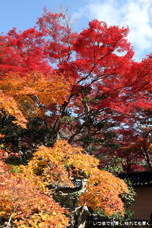 また京都に奥さんと長女と三人で行ってきました。二年ぶりの嵯峨野嵐山の紅葉狩りが目的です。紅葉の時期の嵐山はいつも使う駐車場が観光バス専用になりますので、右京区役所前のパーキングに車をおいて嵐電天神川駅から嵐電で嵯峨野嵐山にはいります。いつも思うのですが、京都は観光地にもかかわらず駐車料金は一日400円とか500円なので良心的です。嵯峨野に着いて定番の二尊院、祇王寺、常寂光寺をまわるだけで、非日常の時間はあっという間に過ぎてしまいます。戻ってきた夕方の渡月橋界隈はすごい人。渡月橋には長い人の列、交通規制のかかった道路は人・人・人・・・。こんなのは京都にはいらないぞと思ってしまうゆるキャラも出現しておりました。最初の二尊院の紅葉です。ここの紅葉をみなくては嵯峨野に来たとは言えないほどの定番のお釈迦様と阿弥陀様のお寺。まさに見ごろの紅葉と境内の雰囲気が最高に絵になるお寺です。