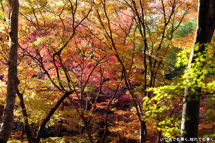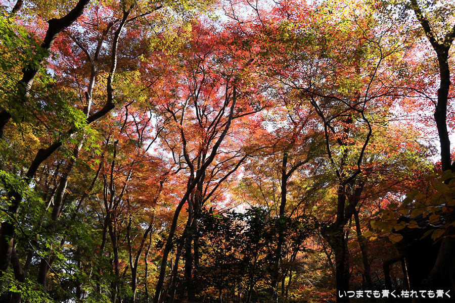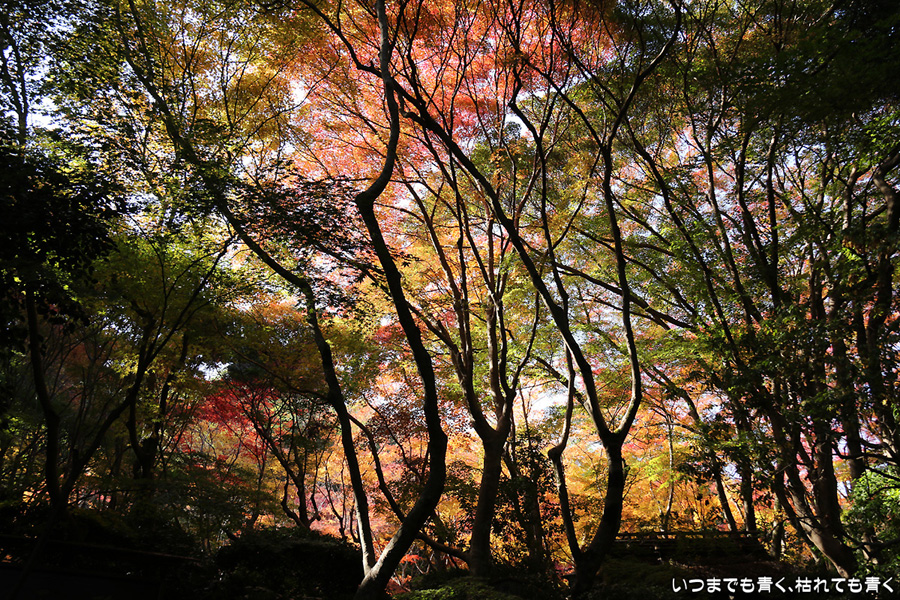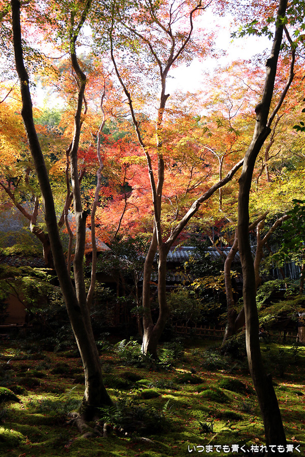 祇王寺は、何度来ても落ち着く、わびしさのただよう平家物語ゆかりのお寺です。ここはまだ青い葉もあり、落葉も含めてこれからが見ごろのようです。