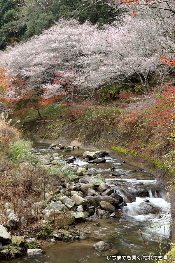 2015年11月23日に撮影した、愛知県豊田市・川見四季桜の里の四季桜と紅葉の写真です。