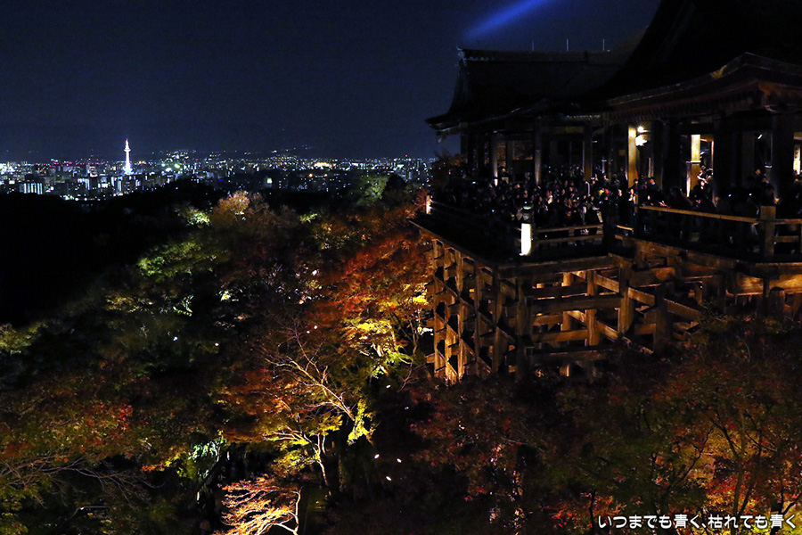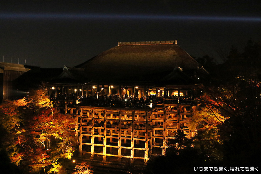 今年の秋の京都のしめくくりは、清水寺夜の特別拝観のライトアップです。清水寺の夜の拝観は、春、夏、秋と年三回行われていて、私は春の東山花灯路の時にけっこう来ているのですが、秋の紅葉の時期に来るのは初めてです。そもそも紅葉の時期は、嵐山、東福寺や南禅寺近辺に行くことが多いので、どうしても清水寺は来る機会が減ります。夜なので紅葉の色づき具合はわかりませんが、本堂の舞台からみるライトアップされた紅葉、奥の院から見るライトアップされた清水の舞台は、とても美しいものです。観音様の慈悲の心を表している青い光の筋が幻想的で、朱色の仁王門や三重塔、ライトアップでオレンジ色に染まる清水の舞台とよく合います。