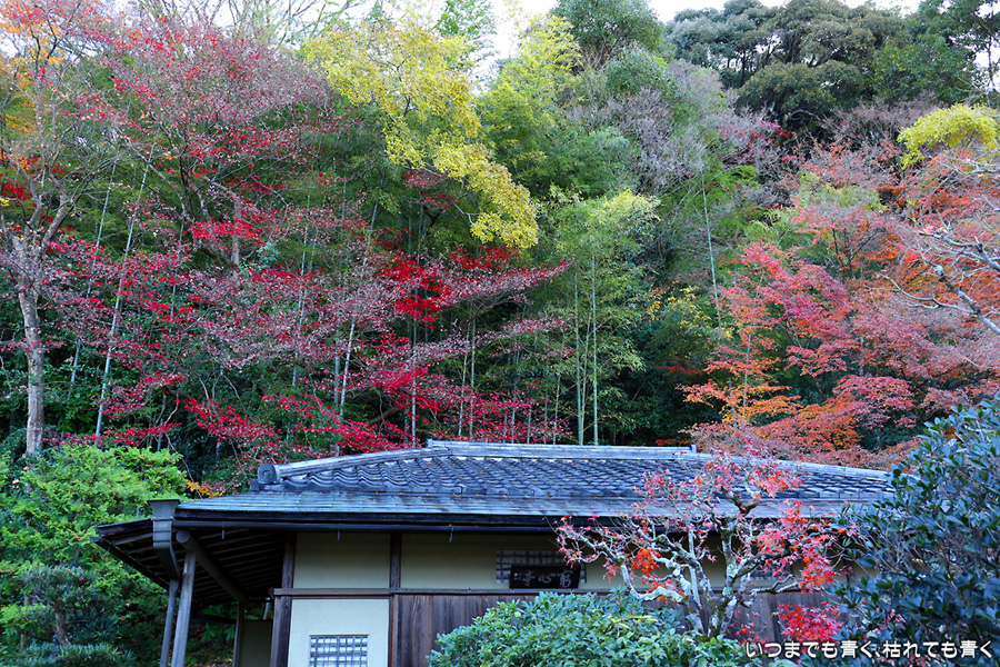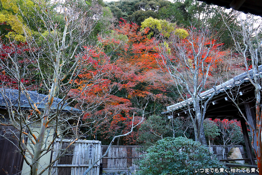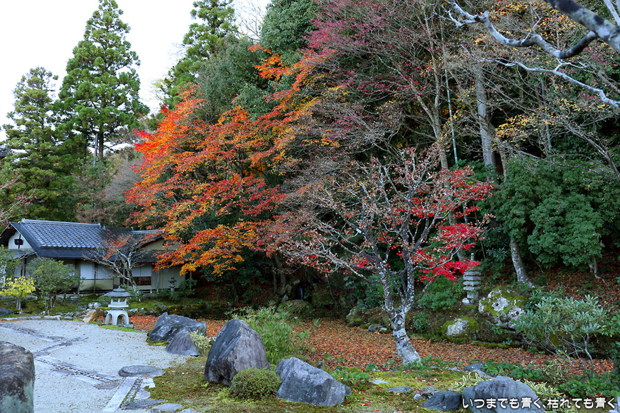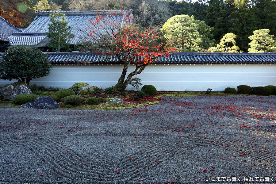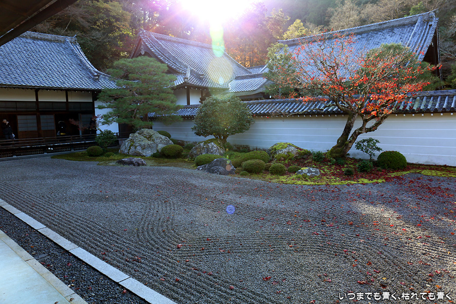 まだ朝の9時前の庭園、残っている紅葉が少ない上に、朝日は低く木々の葉の色は沈み込んでいます。紅葉を楽しむという目的は果たせませんでしたが、朝日を浴びてひんやりと澄んだ空気の中で、ひとりで白砂の庭をぼんやりと眺めるといういい時間を過ごすことができました。