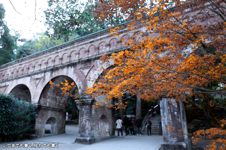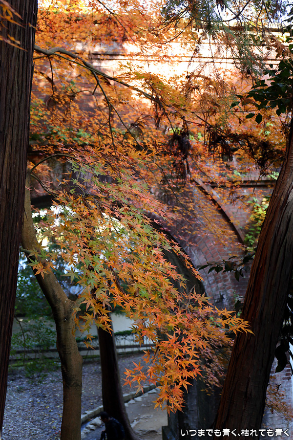 紅葉真っ盛りの時期ならば、水路閣と周辺の紅葉とがよく似合うのですが、今回はすでに水路閣周辺に美しい紅葉はなく寂しい情景でした。