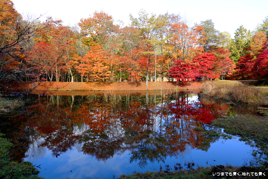 駐車場整理をしていた方に紅葉の状況を伺った時に「少し遅いと思うのでがっかりしないでね」と言われたのですが、がっかりするところなどはまったく無くまだまだ見頃で美しい紅葉でした。風がなく静かな池の水面にうつる紅葉と青空も素敵でした。広くはないところですがそれほど人も多くなくのんびりと紅葉を楽しめるいいところでした。
