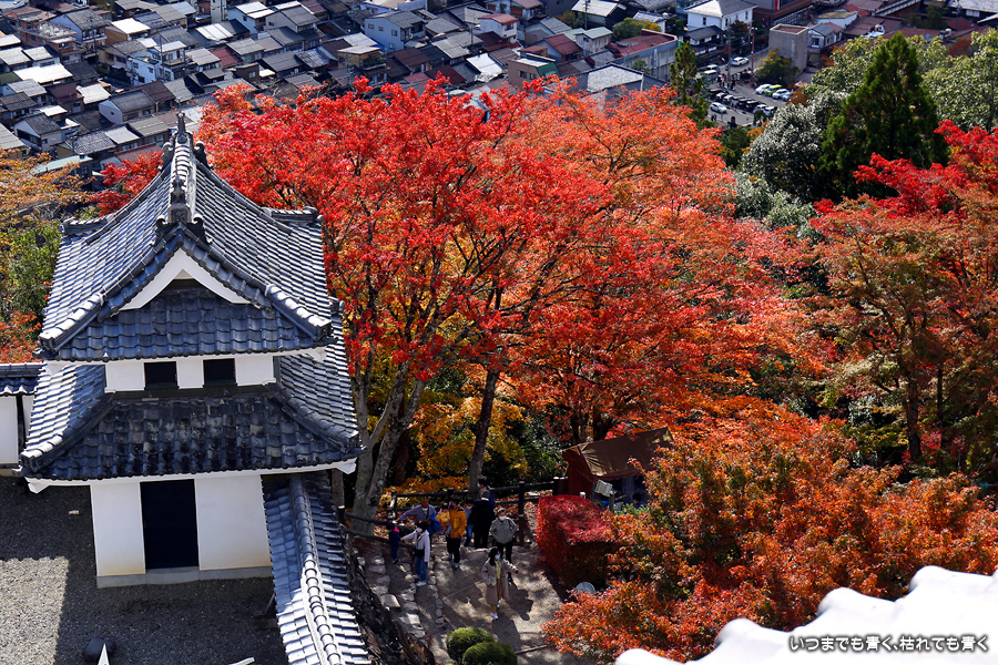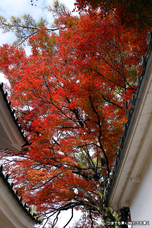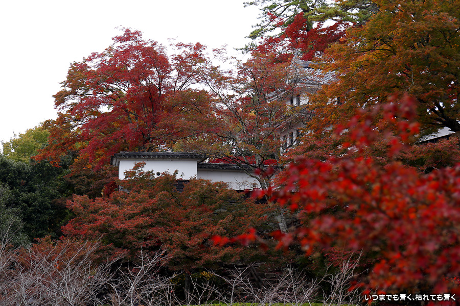 天守炎上と言われるように紅葉に包まれる天守の写真を撮ることができるのがここの魅力です。まだ青葉も残っていますが、紅葉の葉はまだ形も美しく全体的には見頃でいろいろな場所での撮影を楽しむことができました。定番の撮影場所からの写真は似通ったアングルになっていますが、微妙な場所の違い、太陽の光の違い、角度の違いを楽しんでいろいろと撮ってみました。