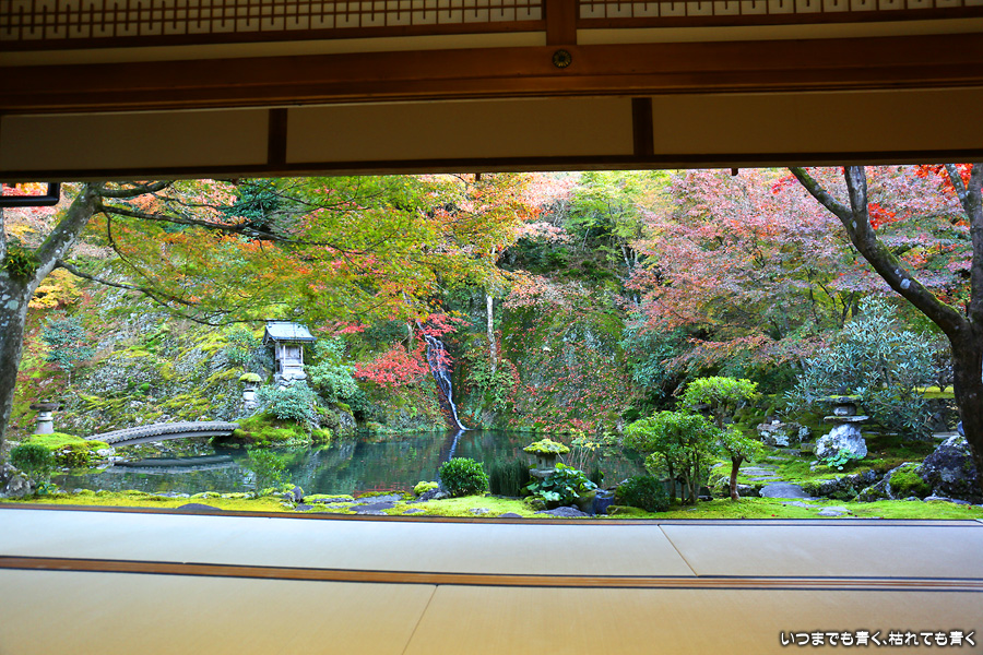 このお寺には「てっ(草かんむりに至)草園」という庭園があり、畳や縁側に座ってのんびりと庭を眺めることができます。庭園の紅葉は、一部は見ごろですが手前はまだ青葉のままで、紅葉の風景の迫力はまだ今一歩という感じでした。