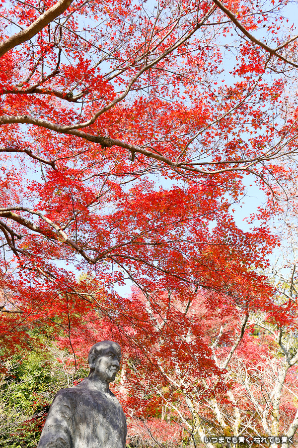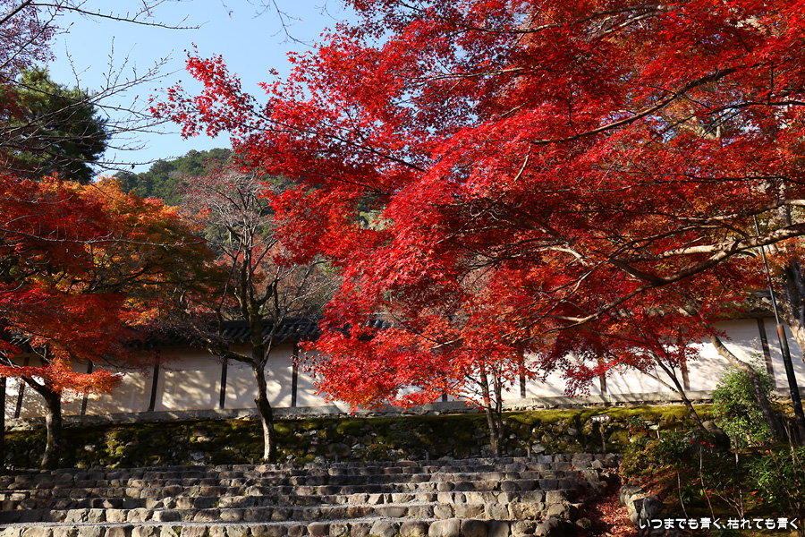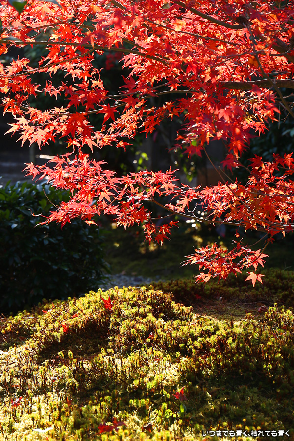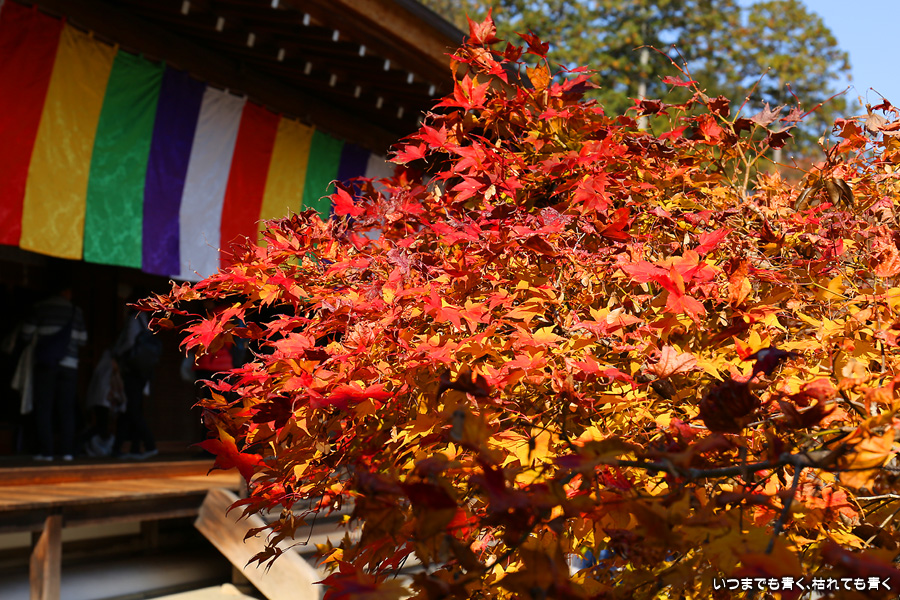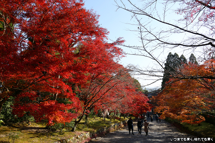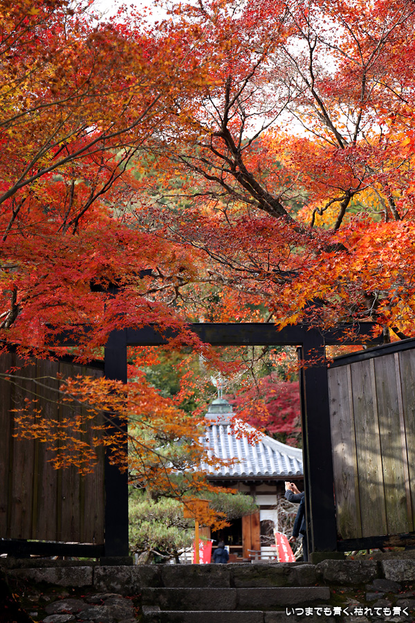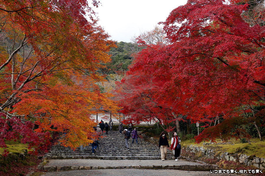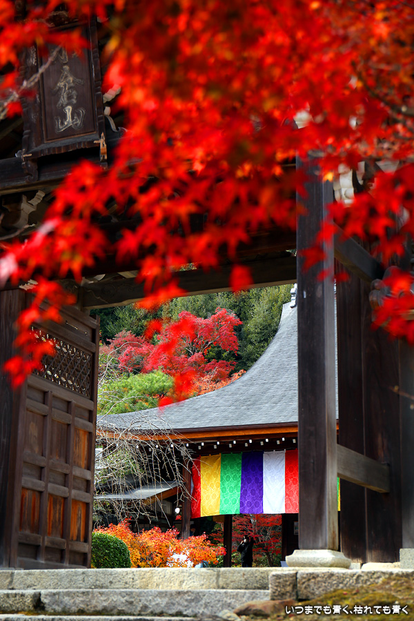 朝一番で人の少ない時に「紅葉の馬場」の写真を撮ろうと思って行きましたが、すでに人は途切れることはなく持久戦となりました。待ったわりには写真としてはありきたりでしかなく、自分なりの構図を探すべきだということをあらためて認識しました。二尊院の紅葉は何度も見に来ていますが、今年もとても素晴らしい紅葉でした。本堂では、のんびりと縁側に座って紅葉を眺めることもできます。