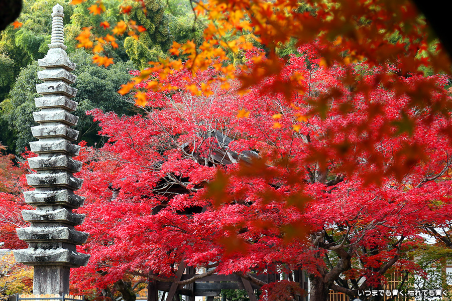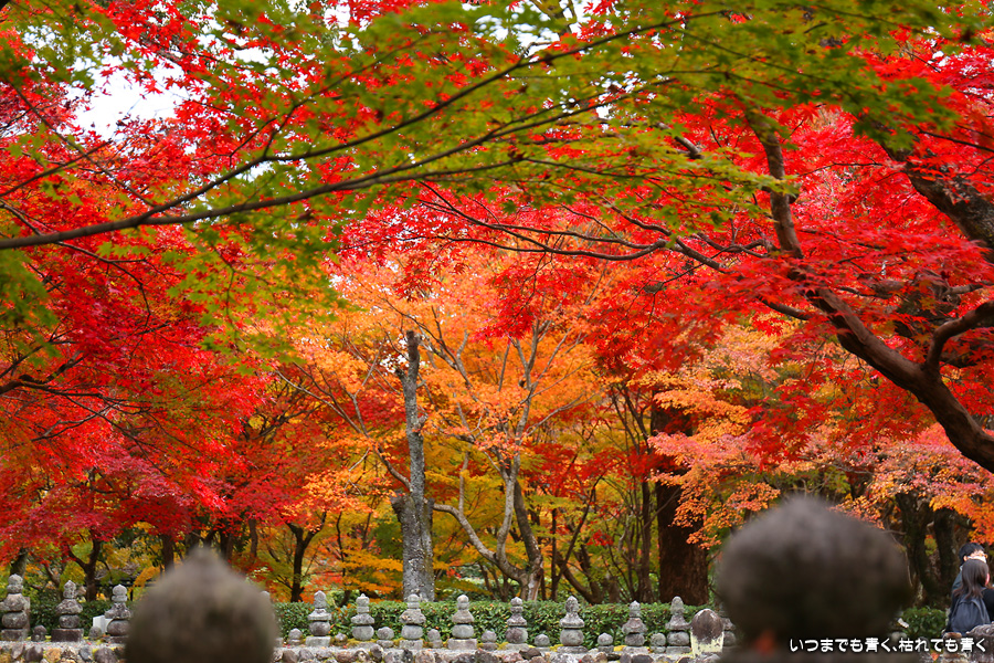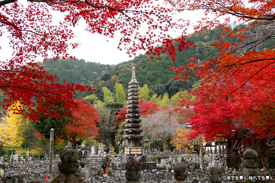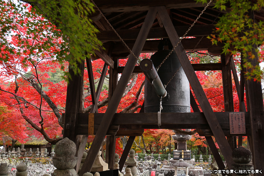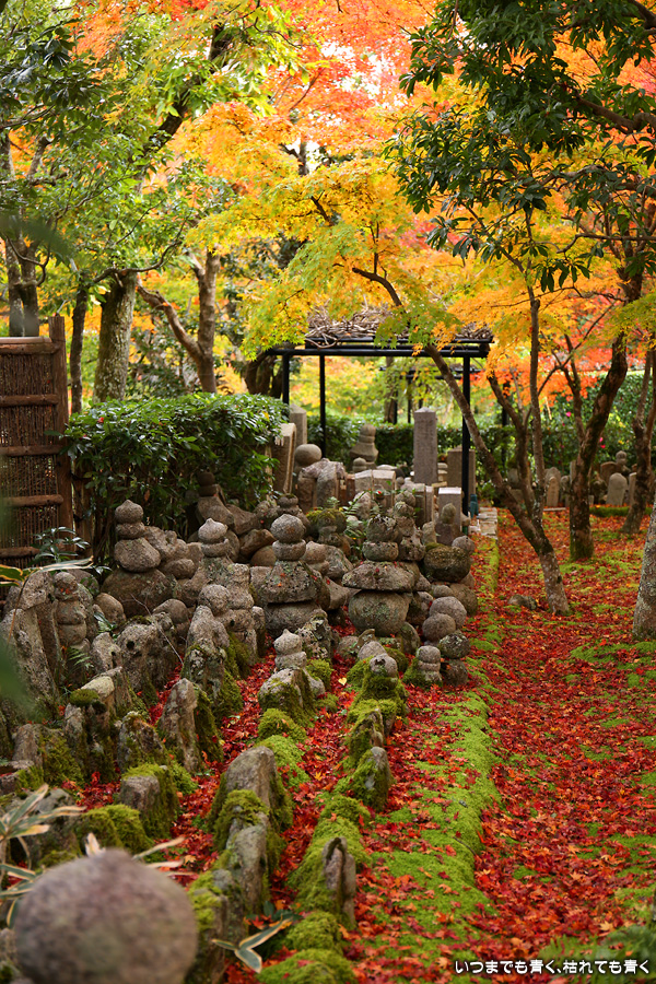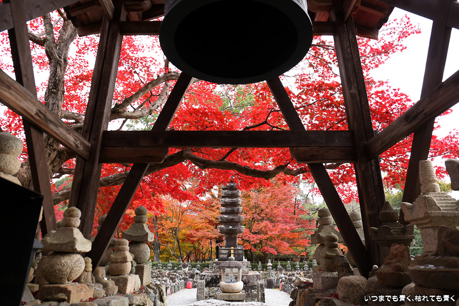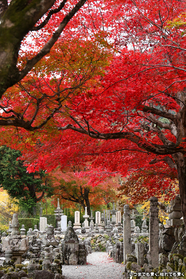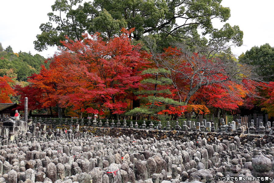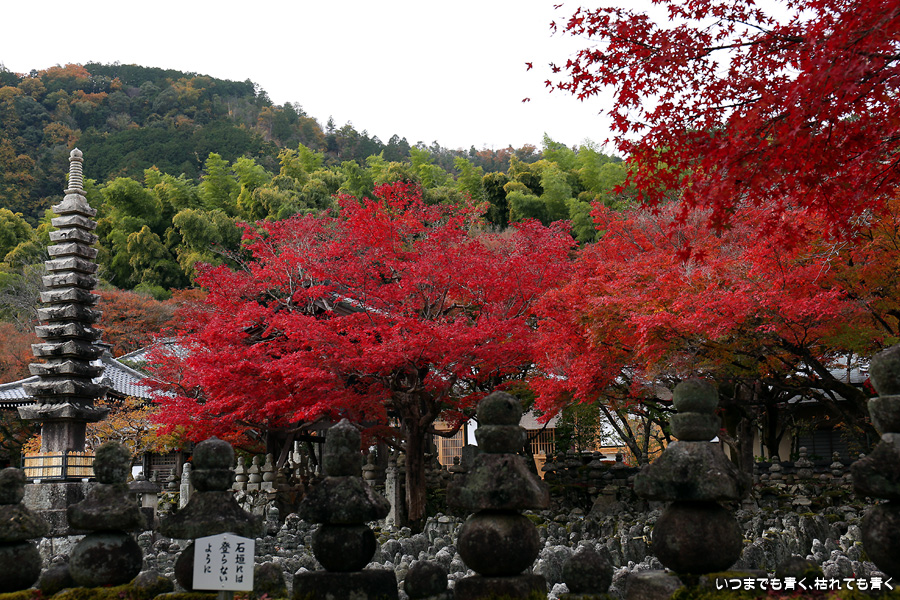 奥嵯峨を深く入ると化野念仏寺があります。かつては「赤い霊柩車」というサスペンス2時間ドラマのイントロの定番となっていたお寺です。その舞台となるのが「西院の河原」と呼ばれる境内の数多くの石仏、石塔です。真っ赤な紅葉と石仏、石塔は写真では良い絵になります。いつまでも写真を撮っていたい美しさでした。