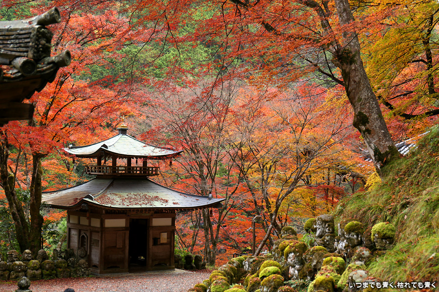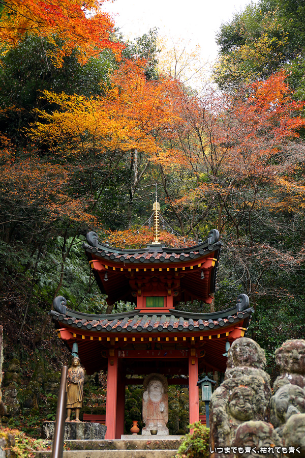 化野念仏寺からさらに奥に入るとあるのが愛宕念仏寺で6年ぶりの訪問となります。このお寺も1時間サスペンスドラマでよくロケ地となっていたお寺です。ここの紅葉は真っ赤ではなく黄色やオレンジ色ですが、数多くの羅漢の石像、本堂、多宝塔、ふれ愛観音堂、地蔵堂とよく似合います。