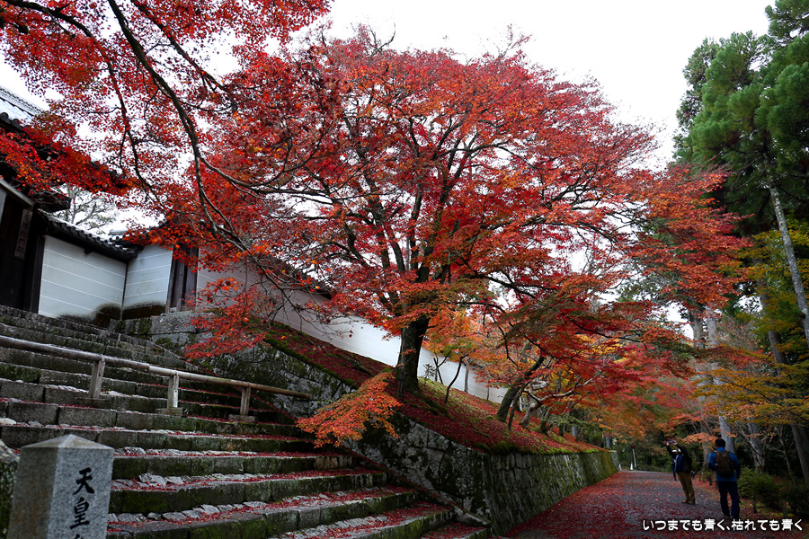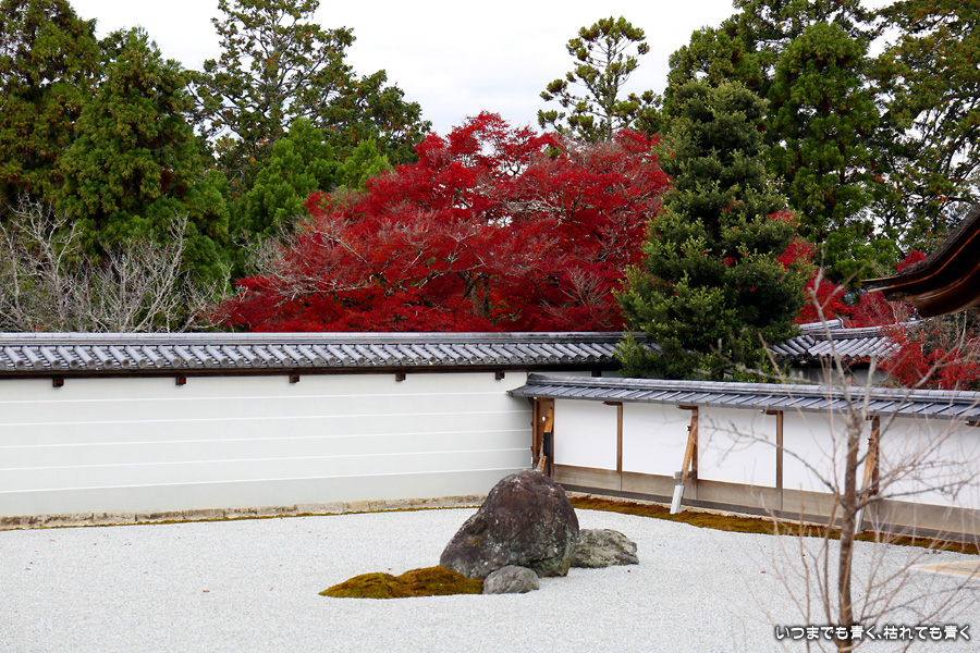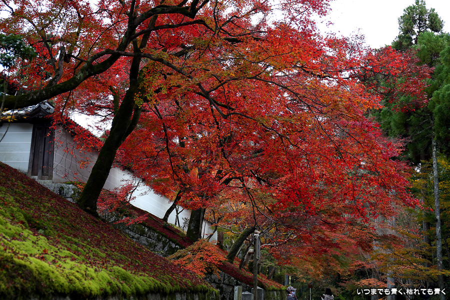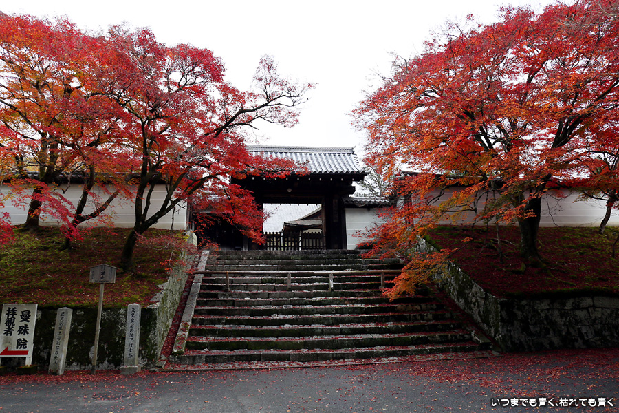 4年ぶりの曼殊院ですが、その時と大きく変わっているのは、今まで梅林があったところに新しい宸殿ができて、その前には「盲亀浮木之庭」と呼ばれる広い石庭ができていることでした。大玄関から大書院に向かう斜めの通路もなくなっていました。書院前の庭園は今まで通りですが、宸殿の方はかなり以前の雰囲気とは異なっています。宸殿は150年ぶりの復興再現だそうです。ちなみに宸殿とは門跡寺院にある歴代天皇・皇室関係者の位牌を祀る施設です。紅葉は見頃でしたが天候がよくないので華やかさよりも落ち着いた雰囲気の紅葉でした。
