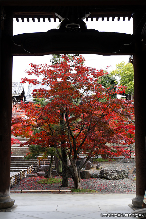 秋の京都ぶらりひとり旅の二日目は、金戒光明寺の駐車場に車を置いて徒歩で寺社を巡ることとします。金戒光明寺には紅葉の美しい庭園もあるのですが、今回も山門近辺の紅葉見学のみとしました。山門周りの紅葉は真っ赤に美しく染まっていて山門と紅葉が絵になります。ただ、電線がどうしても入ってしまう構図にせざるを得ない場合もあって、山門近くの電線だけは無くせないものだろうかといつも思ってしまいます。