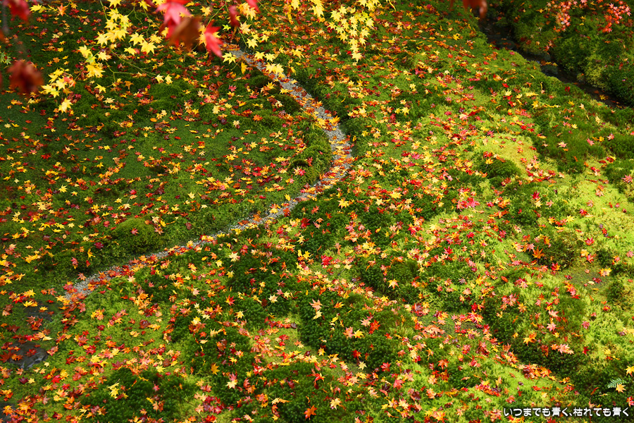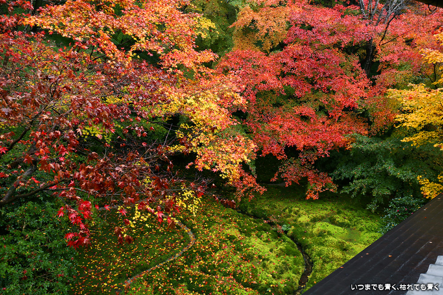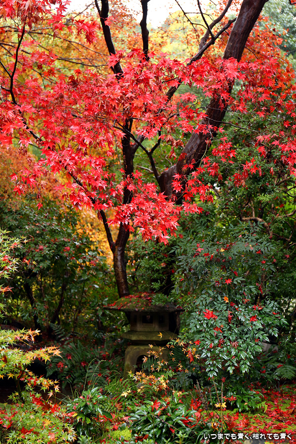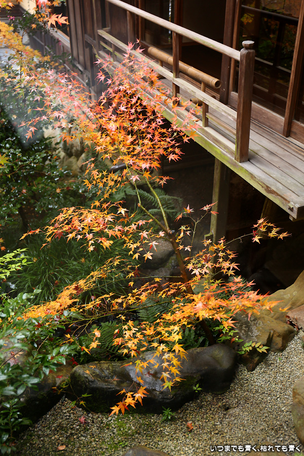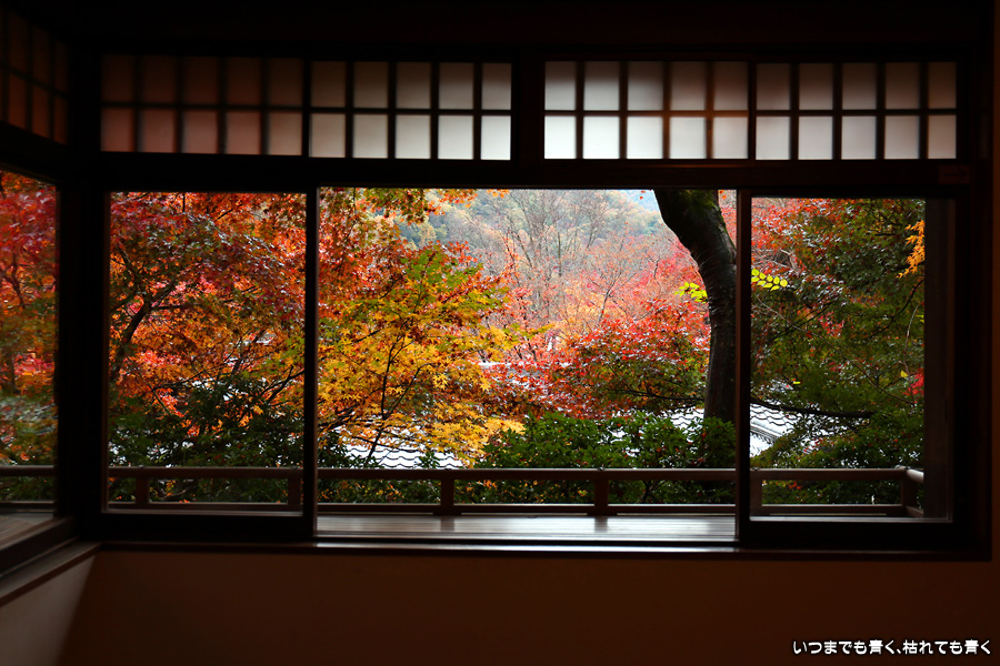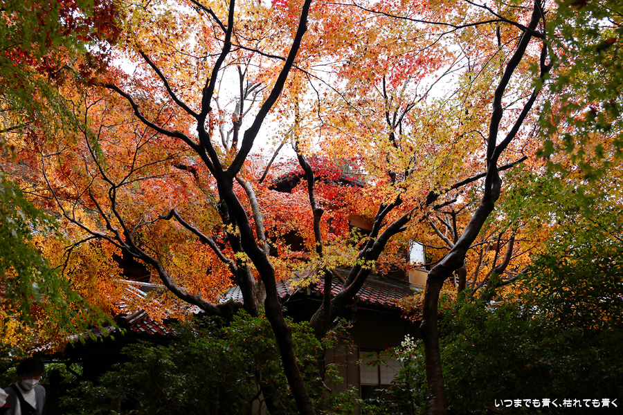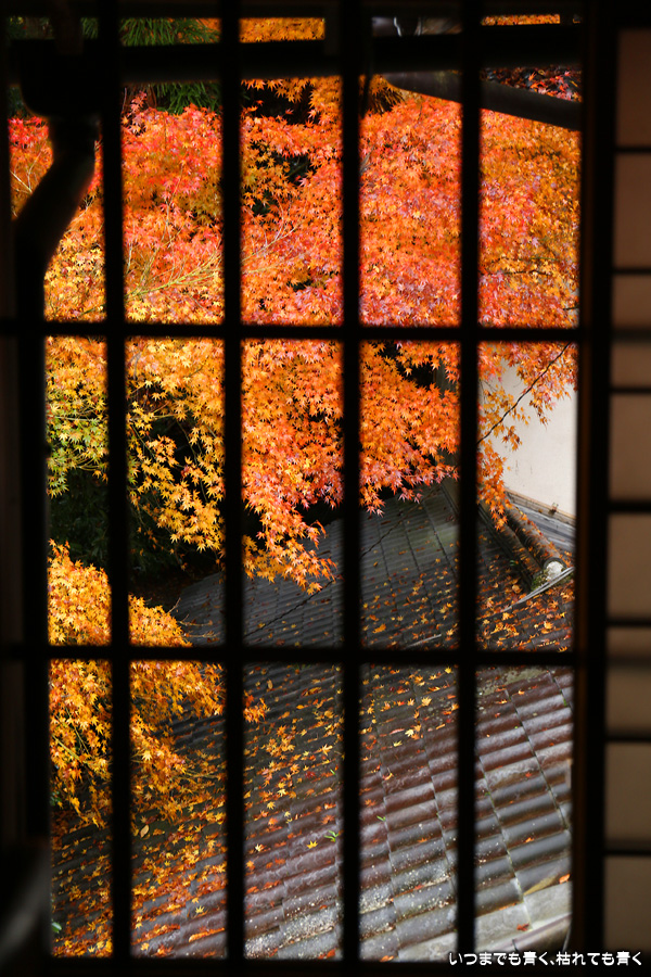 瑠璃光院は、コロナ以前から予約制であったことと拝観料が2,000円と高いということで、なんとなく「見せてやる」というような高飛車的なイメージを持っていました。なので今年も最初は行くつもりなかったのですが、5泊6日京都ぶらり旅の出発日前日の11月19日時点でちょうど真ん中の11月23日が本降り雨予報でどうしようかと考えた時に、瑠璃光院ならば室内だし行ったことがないので行ってみるのもいいかということで拝観を決めました。すぐに予約を調べると、23日は祝日ながら天気予報が良くないせいか13時にまだ空きがあり予約もできました。そういう経緯で拝観した瑠璃光院ですが、思っていた以上にとても良かったです。どこからも絵になる情景ばかりで眺めて写真を撮っていたらあっというまに1時間は経ってしまいます。ただ、時間制でも追い出されたりすることはなく、ゆったりと楽しむことができました。真面目な私は長居はよくないと思って後ろ髪引かれる思いで出てきましたが、もう少し長居をさせていただいて構図をいろいろと考えればいい写真が撮れたかもしれません。特に雨に濡れた庭は風情を感じられて素敵でした。また、机に映り込む有名な写真の撮影は、私が撮った位置よりももう少し下から撮るのが正しかったようです。お寺の方の対応は、事前に勝手に抱いていた高飛車的な対応とはまったく異なり、とても丁寧で親切でした。たぶん、来年から瑠璃光院ははずせない場所になりそうです。