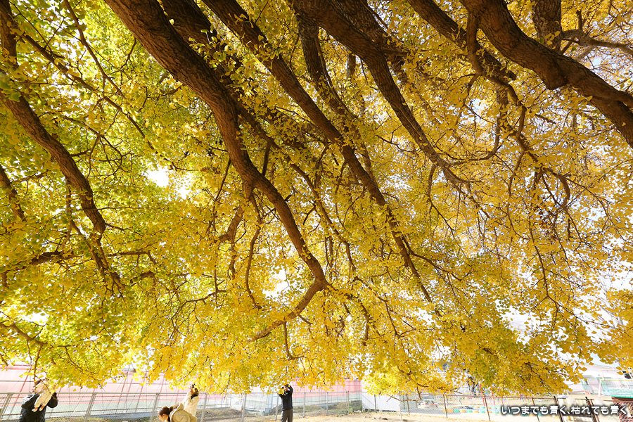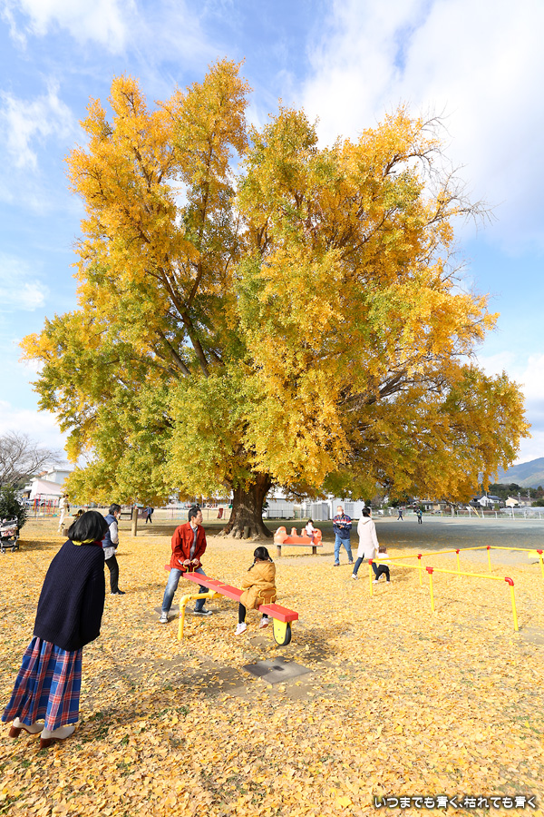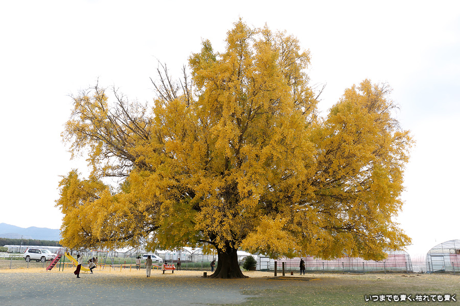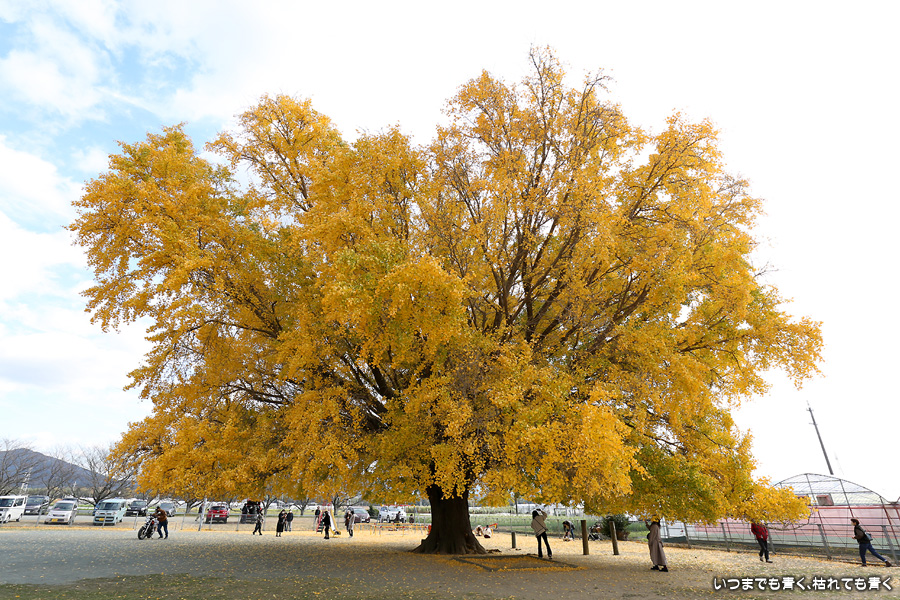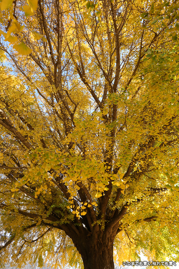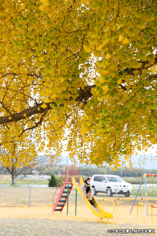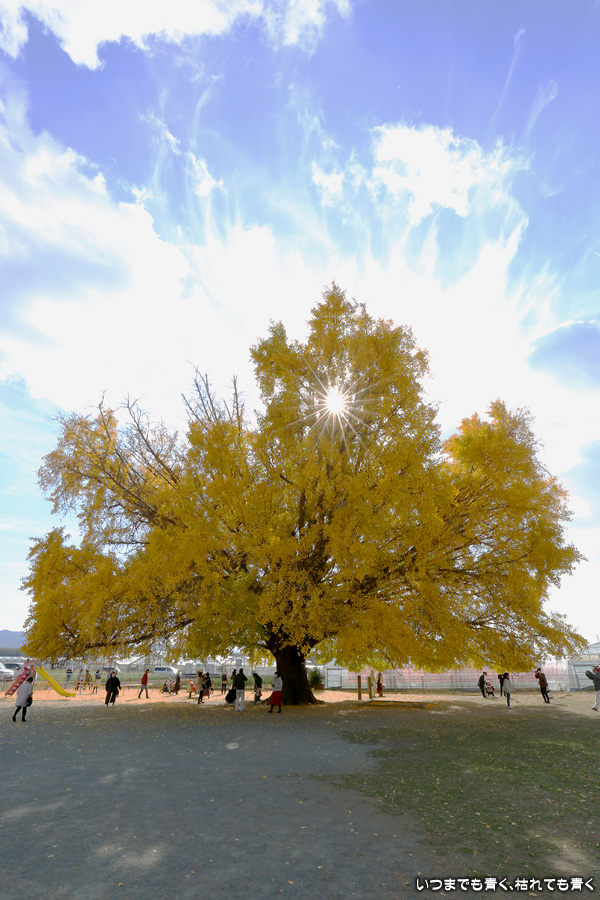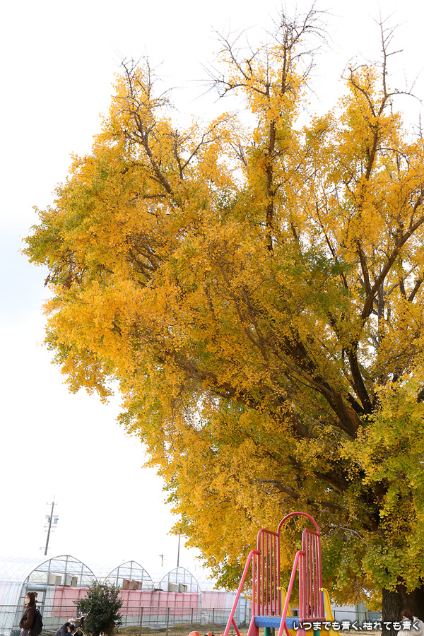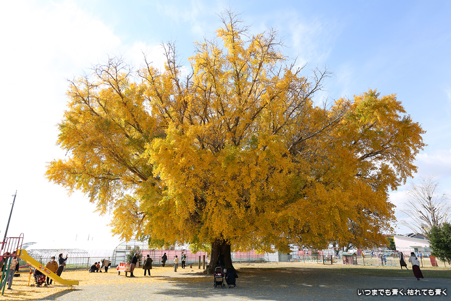 前日のニュースで見ごろだと聞いて豊川市に見にきました。場所は砥鹿神社の近くです。最初見た時はその大きさに驚きました。たくさん集まっている人が小さく見えます。近くにはブランコや滑り台が設置されていて、子供たちが遊んでいます。葉の色は、ニュースから真っ黄色のいちょうと期待していきましたがまだ青い色が残っている状態で、できれば真っ黄色になった時の姿も見てみたいと思いますが、落葉との兼ね合いで一番いい時期に出会うのは難しいかも知れません。写真はいろいろと撮ってみましたが、目で見る大きさや迫力を伝えるのは難しそうです。着いた頃は青空が広がっていましたが、1時間くらいしたらどんよりと曇って冷たい風が身体にきつくなってきました。