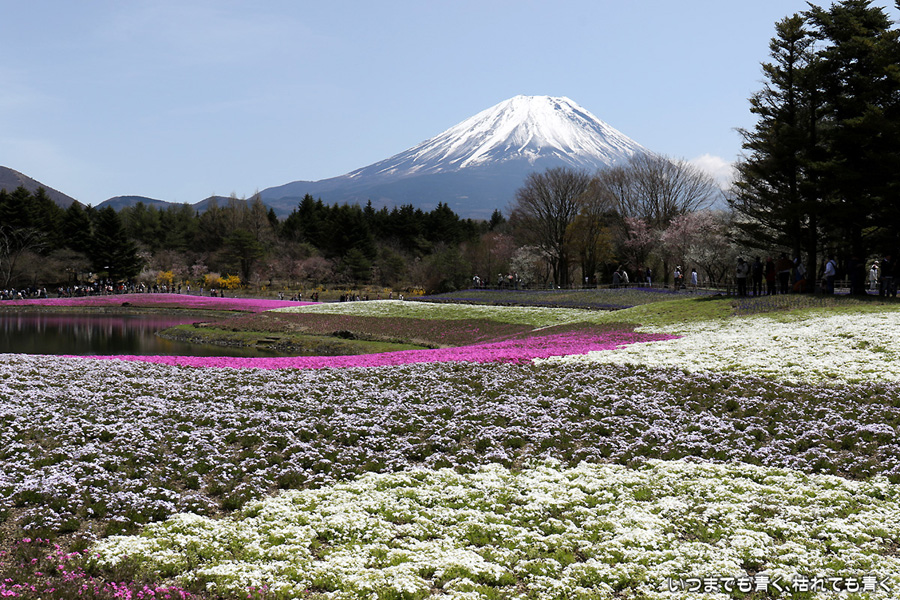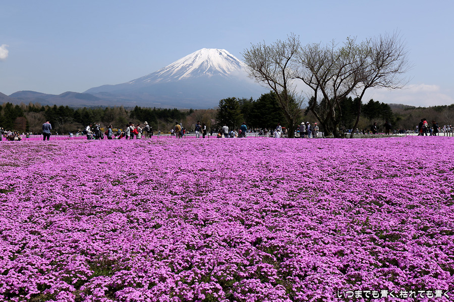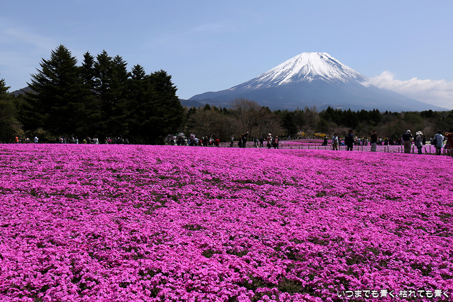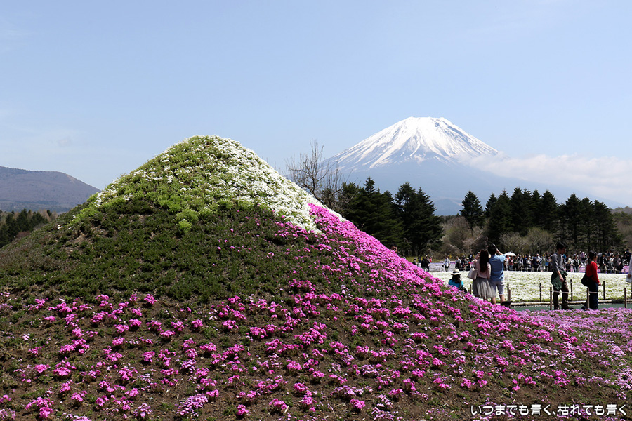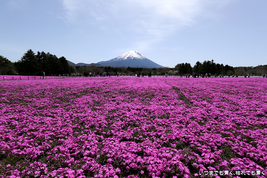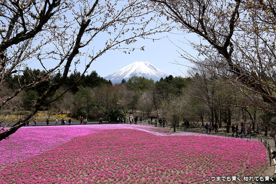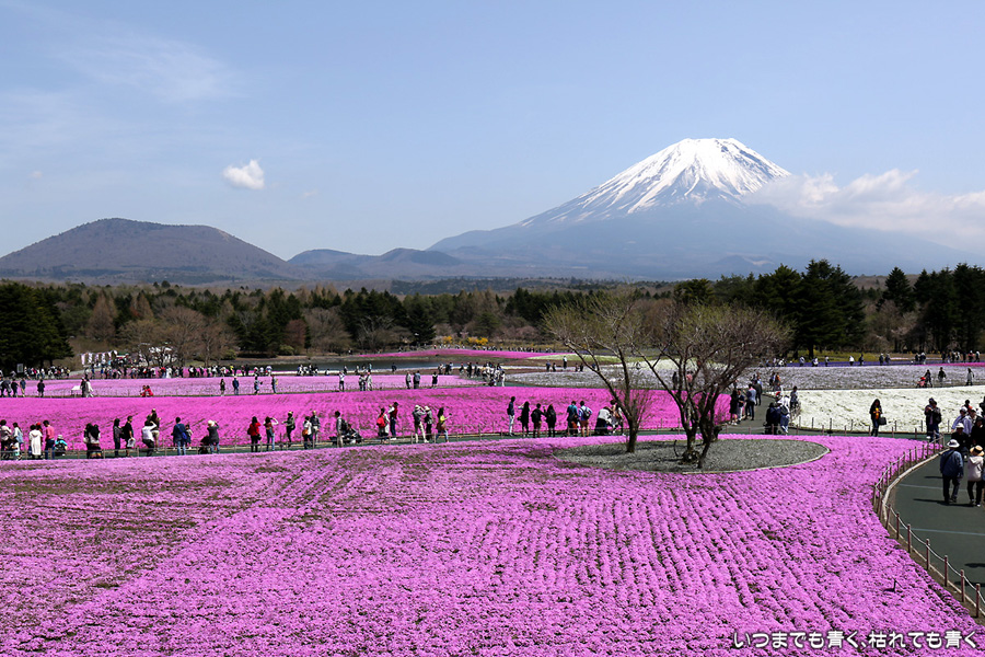 昨日着いた時は、急な悪天候で富士山は見えなかったのですが、今日の富士山はとても美しく見えました。目的の富士芝桜まつりは、広くて壮大。ただ、芝桜の密度が低く、地面が見えているところがちょっと残念に感じました。