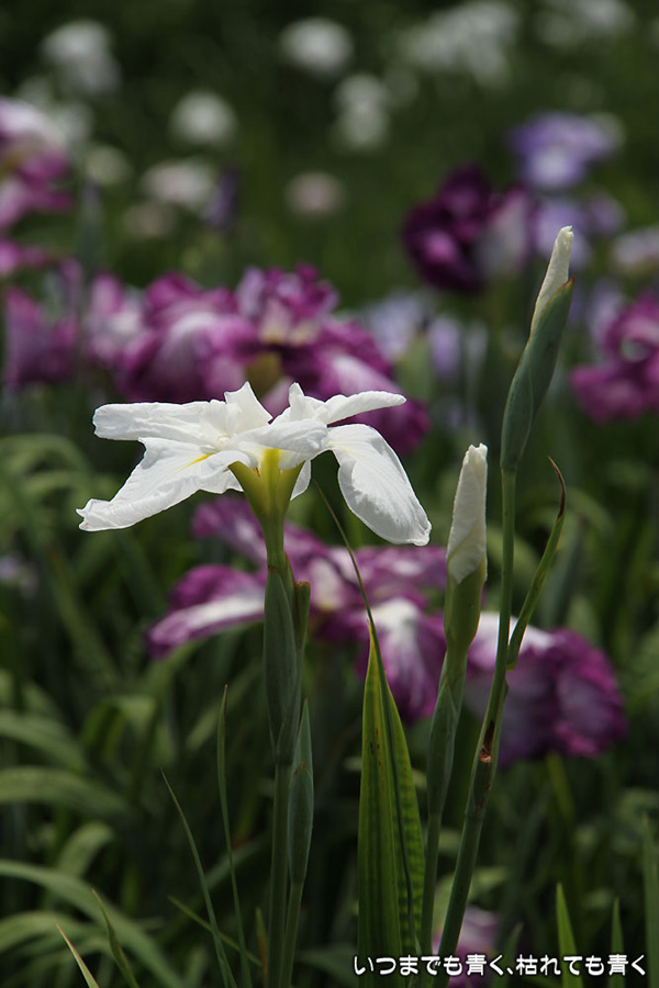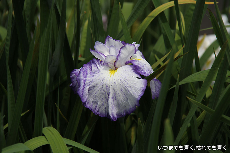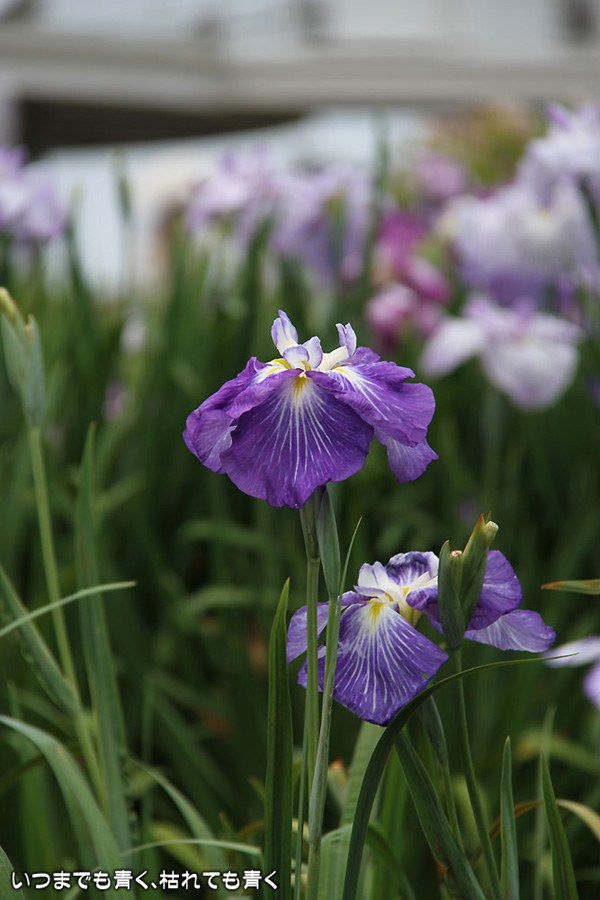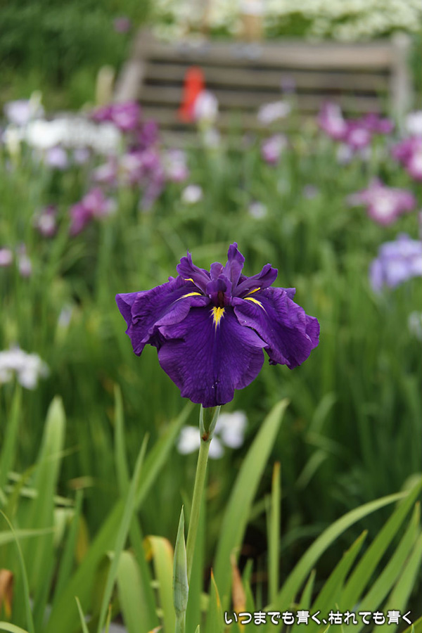 7月8日までは「あじさい・花しょうぶまつり」ということになっていましたが、紫陽花はもう時期が過ぎていました。しかも、花壇に植えられた紫陽花というのは、風情がなくてダメでした。紫陽花という花は、寺社などの庭が似合うような気がします。そのかわりに楽しんできたのが、花菖蒲。花菖蒲は、たくさんの数と種類が植えられていて、のんびりと眺めて楽しむことができました。花菖蒲も、紫陽花の花壇に囲まれた場所に植えられていて、周りの風景との調和を楽しむという風情はありませんが、数が多いので花菖蒲同士で構図をとって写真を楽しむということはできました。構図決めはなかなか難しいですが。相変わらず、ありきたりの構図の写真ですが、花菖蒲苑の雰囲気を残しておければと思います。