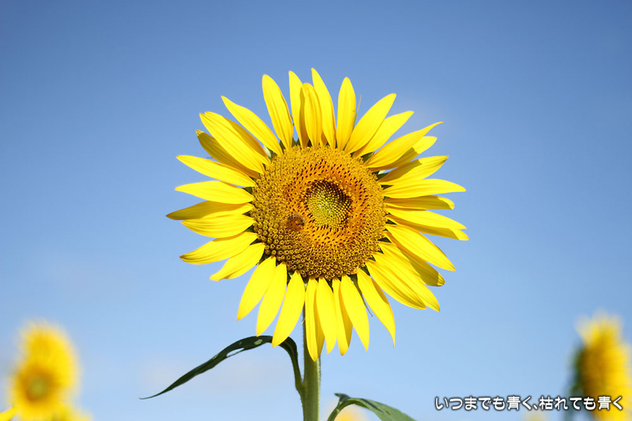 自分で運転していると気づきにくいのですが、先週、バスに乗って窓の外を眺めていて、家の近くの休耕地に向日葵(ひまわり)畑があることを知りましたので、今日、カメラを持って出かけてきました。そのあたりの休耕地は、農林水産省の農地・水・環境保全向上対策として、景観植物が植えてある場所です。以前に秋桜(コスモス)を撮りに来たことはあるのですが、向日葵が植えられているのは、初めて知りました。向日葵畑の隣の土地には秋桜の看板がありますので、もう少ししたら秋桜もまた楽しめるようです。向日葵は少し小ぶりの向日葵でしたが、これから咲こうとするものもあって、今が見頃とばかりに元気に美しく咲いていました。向日葵にはたくさんのミツバチが集まってきていて、一生懸命に花粉を集めているのが可愛らしかったです。周辺は住宅や電線があったりで、撮影に適した土地とは言い難いですが、夏が終わってから(残暑は厳しいですが・・・)向日葵畑に出会えるとは思っていませんでした。忘れた夏を取り戻したような感覚でした。
