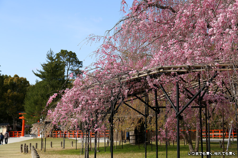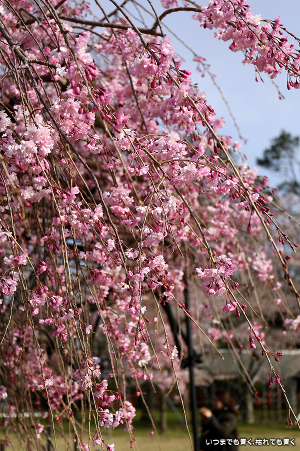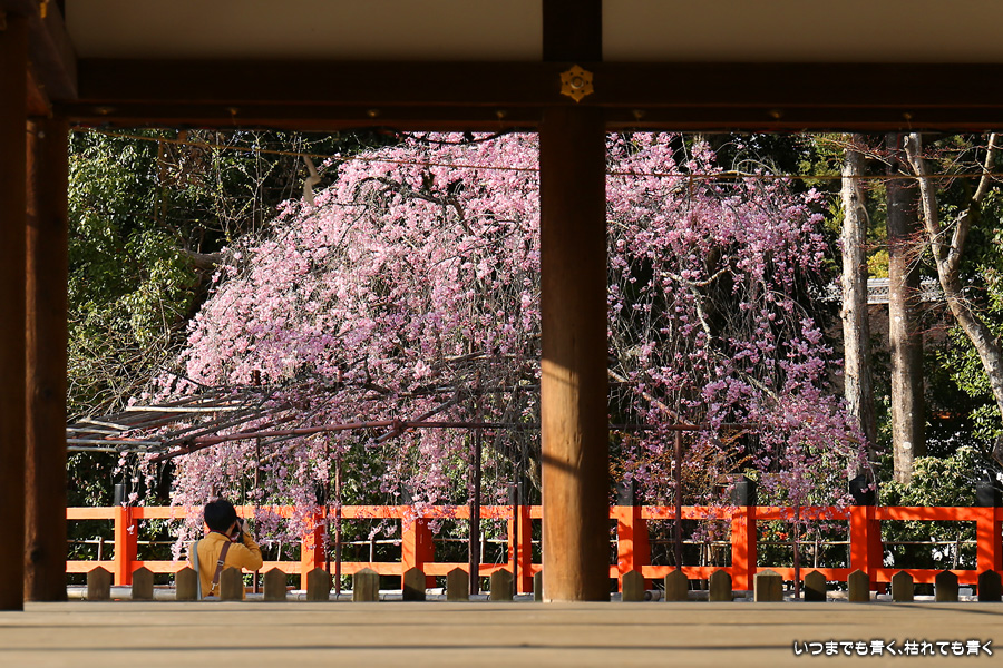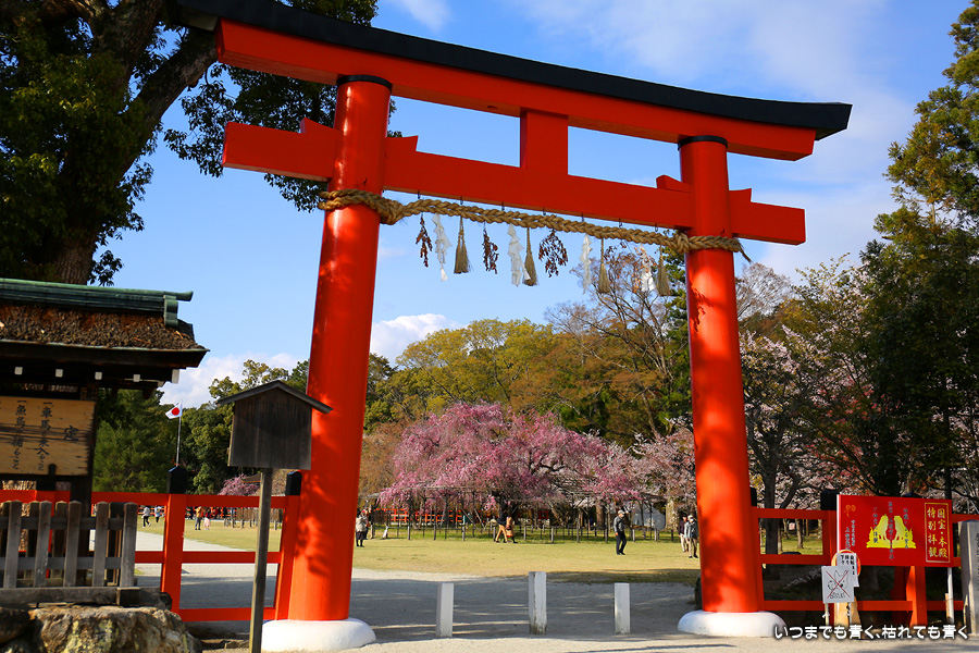 なんにも考えずに、京都の桜を見ようと出かけた今回の旅ですが、最後に、御朱印巡りの間伐材のコースターをいただくために上賀茂神社を参拝しました。上賀茂神社の桜といえば、斎王桜と御所桜ですが、御所桜はすでに見頃を終え葉桜でした。二の鳥居の東側にある風流桜と西側にあるみあれ桜はまだ楽しめました。