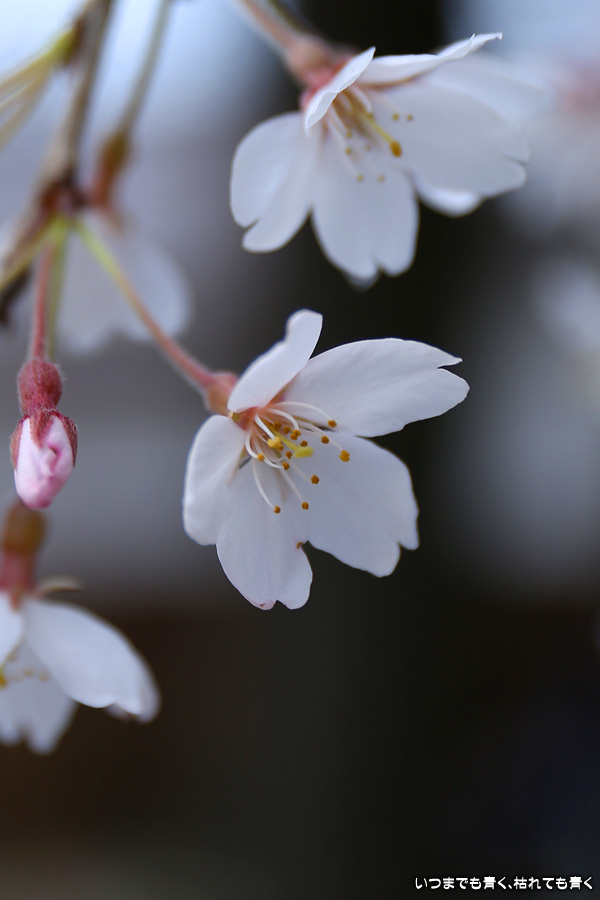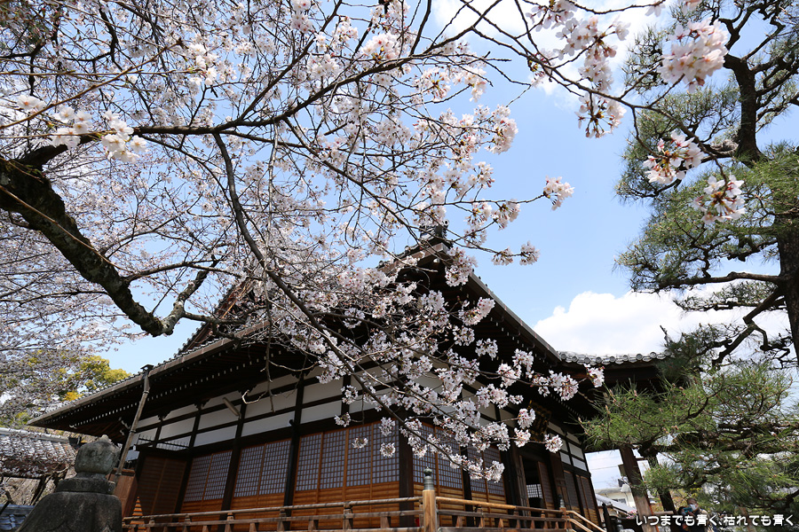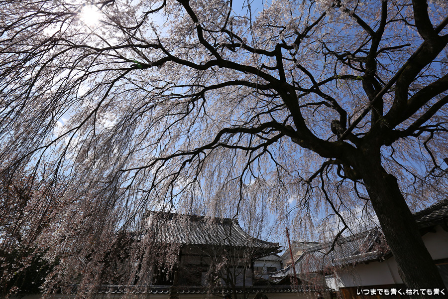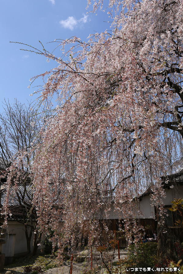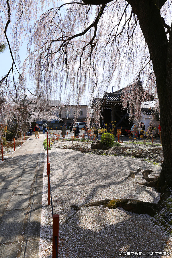 このお寺には、見事な枝ぶりのしだれ桜があります。西門を入り左手にあるしだれ桜を見た時は、あまりの存在感に思わず声をあげてしまいました。すでに一番の見ごろは過ぎているようで、少し風が吹くと花びらが流れるように散っていきます。それもまた美しい光景でした。