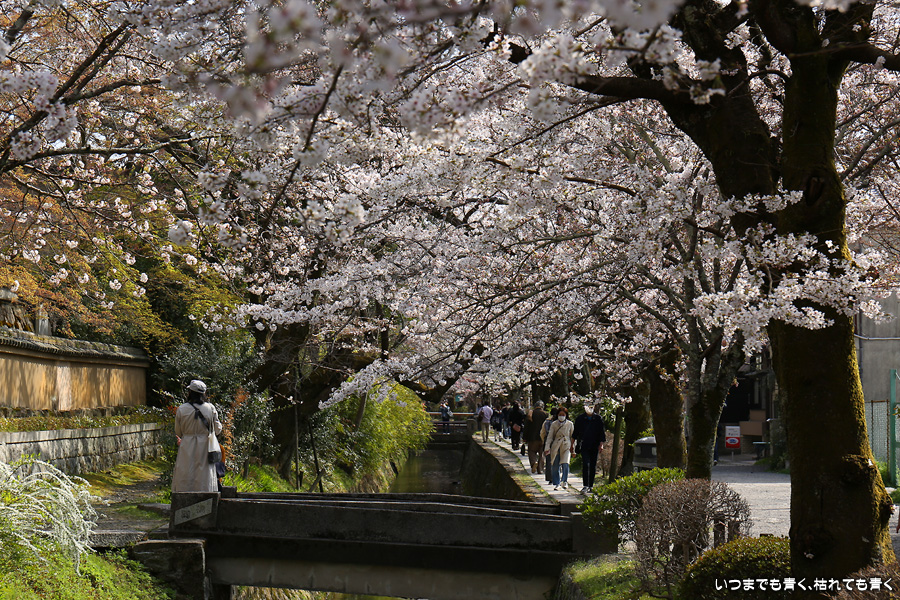 哲学の道の桜は、満開の時に訪れると琵琶湖疎水の上を桜がアーチのように覆っていて、とても美しい光景を見せてくれます。散り始めた時のピンクの花びらに染まる疎水の流れも素敵です。最初の4枚は疎水脇の桜ですが、銀閣橋の手前の写真ですので厳密には哲学の道ではありません。