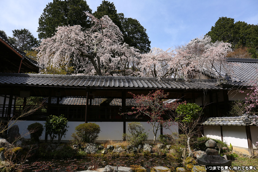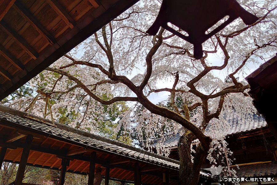 十輪寺は、昨年秋に紅葉を愛でに初めてきたお寺で、中庭のしだれ桜の咲いた光景を見たいと思って訪れました。すでに散り始めていましたが、まだ見頃で楽しめました。中からの写真は明暗の差が大きく、スマホならば美しく撮れますが一眼レフではあとでの現像作業が必須の悪条件でした。掲載した写真のうち、一枚はスマホで撮影した写真です。