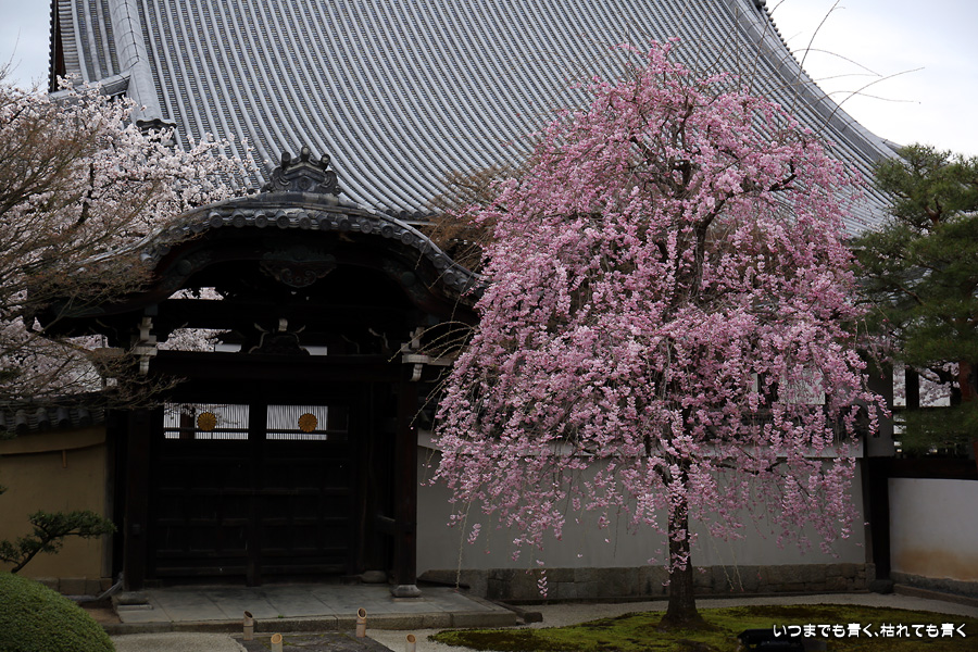 妙顕寺は2020年秋に紅葉を見に来ましたが、このお寺は春のほうが素敵に感じました。同じ場所でも視点の角度や焦点距離を少し変えれば違う印象の写真が撮れるので、時間を忘れて撮影していました。空も幾分明るくなったことと、紅しだれ桜の色のおかげで少しは華やかな印象の写真も撮ることができました。