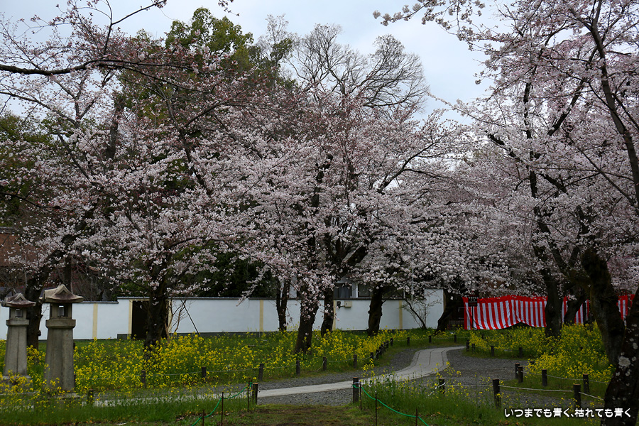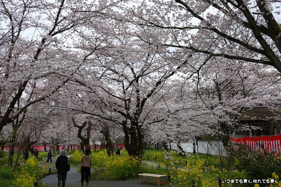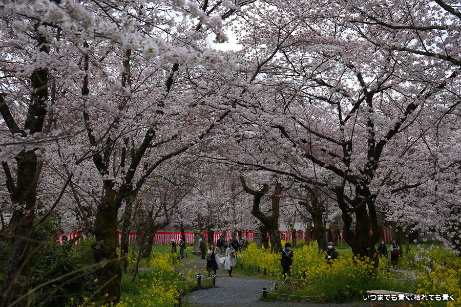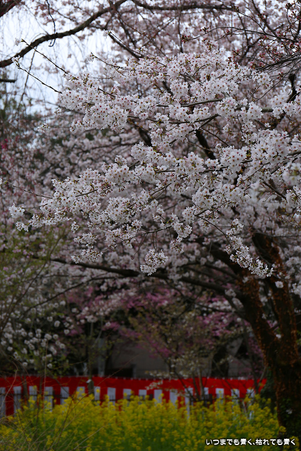 平野神社は2019年の秋以来の参拝となります。その時に広い桜苑があることを知り、今回桜苑目当てに訪れました。桜苑の外の写真と桜苑の内の写真を別にしてあります。こちらは桜苑の内の写真になります。空を覆うような満開の桜が壮観でした。桜の花の色と菜の花の色もメリハリがあって良かったです。今回は天候に恵まれませんでしたが、その天候と訪れた時刻の影響なのか人が少なかったので、撮影は人を気にせずにストレスなく楽しめました。