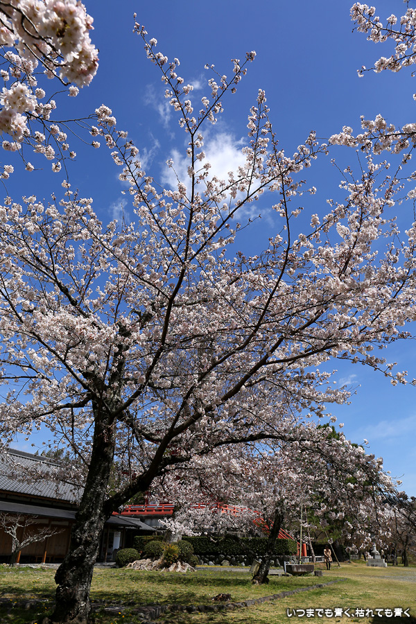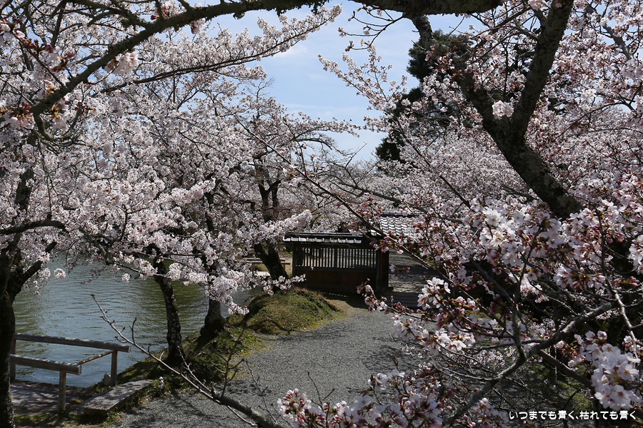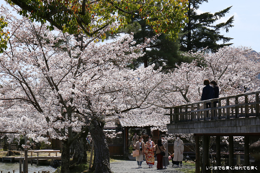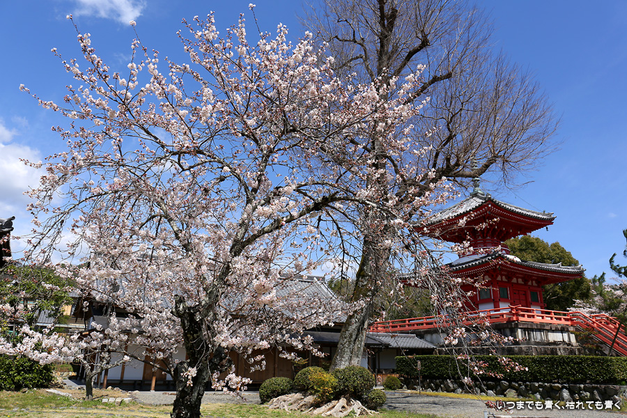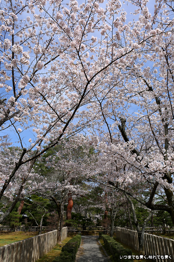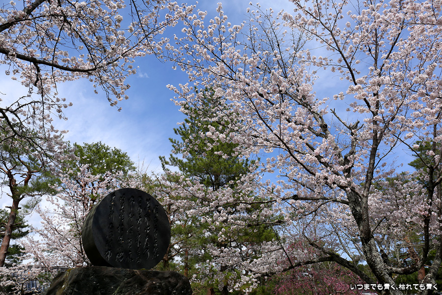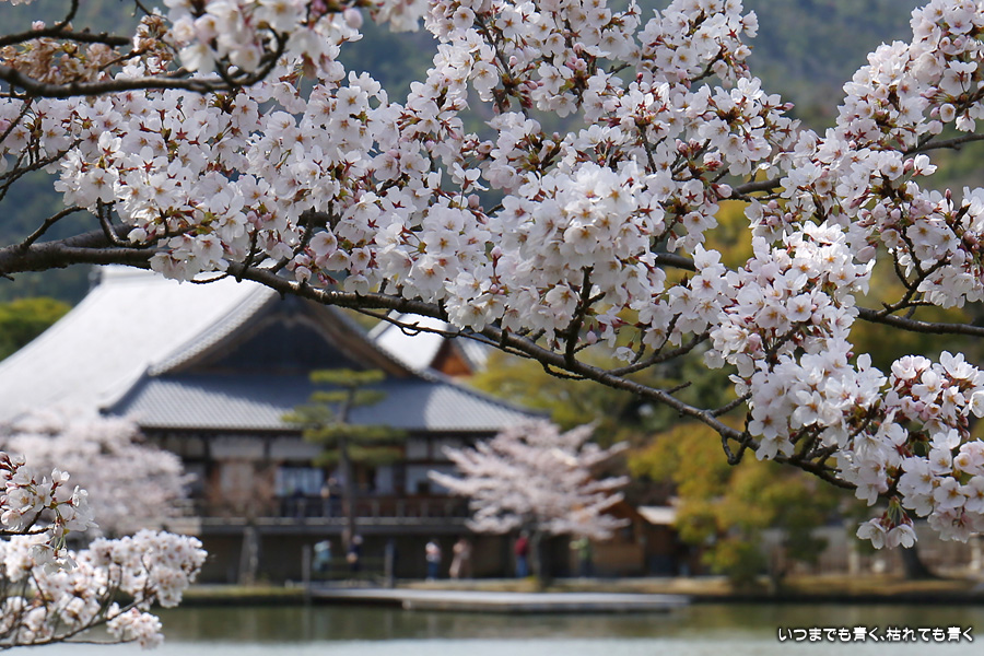 大覚寺は2015年の秋以来の参拝で、桜の季節は初めてとなります。今回はちょうど満開になろうとしている時で、お寺の方の説明によると、今が一番の見ごろだということでした。大沢池は時代劇では必ず出てくるロケ地で、ロケ地好きな私としては見覚えのある景色があって、その場面を思い起こしながら楽しく見てしまいました。心経宝塔と桜の構図はありきたりですが、やはり絵になるので場所を変えながら何枚も撮ってしまいまいました。桜にはやはり青い空が似合います。大覚寺でこの桜を見ることができただけで、今回の京都ぶらり旅の満足度100%です。