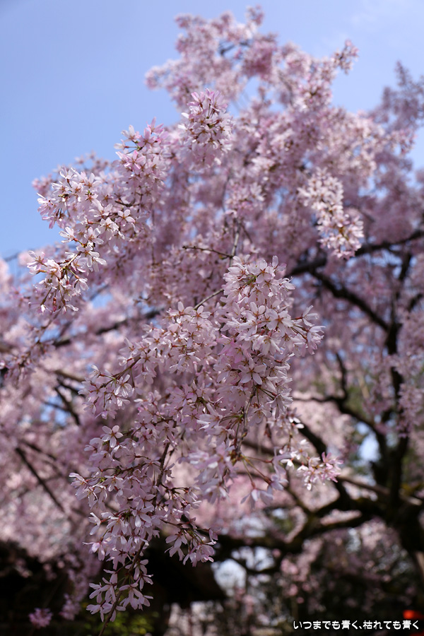 今年は青空のもとの水火天満宮の紅枝垂桜を見ることができました。狭い境内ですので写真の構図に悩んだわりには広角レンズを使わずにこれで納得して撮っていたのが悔やまれます。面倒がらずにいろいろと試してみることが大事です。SNSで、広角レンズで鳥居に向かい合って撮った写真を見て、そういう撮り方もあったかと次の課題もできてしまいました。