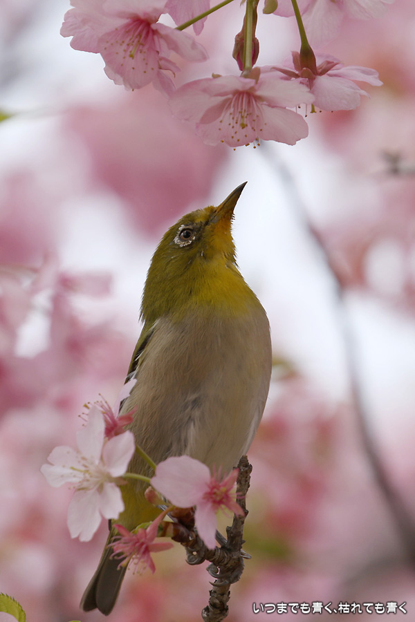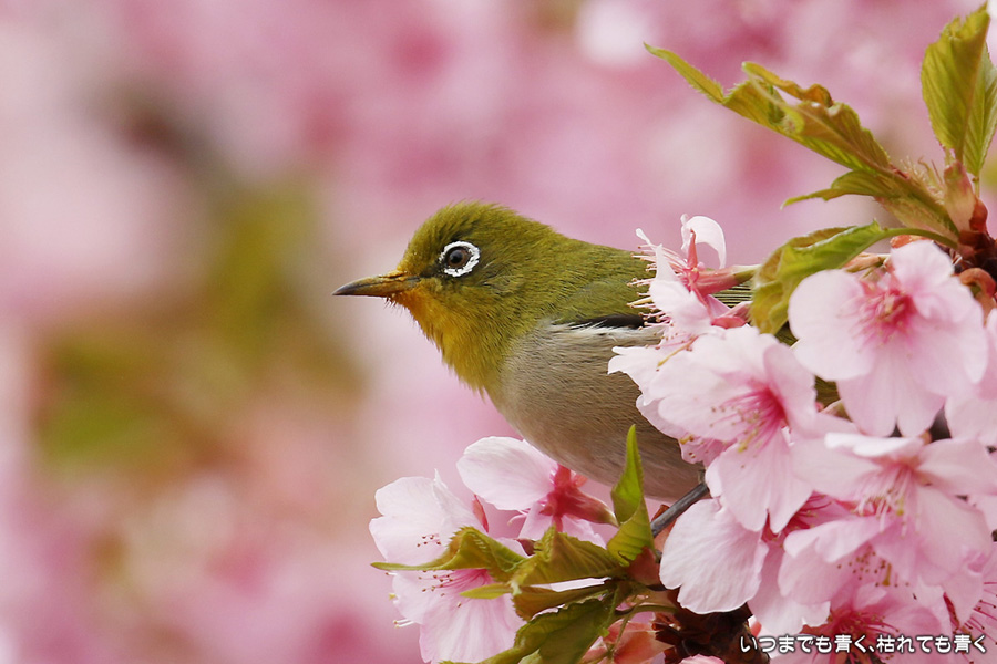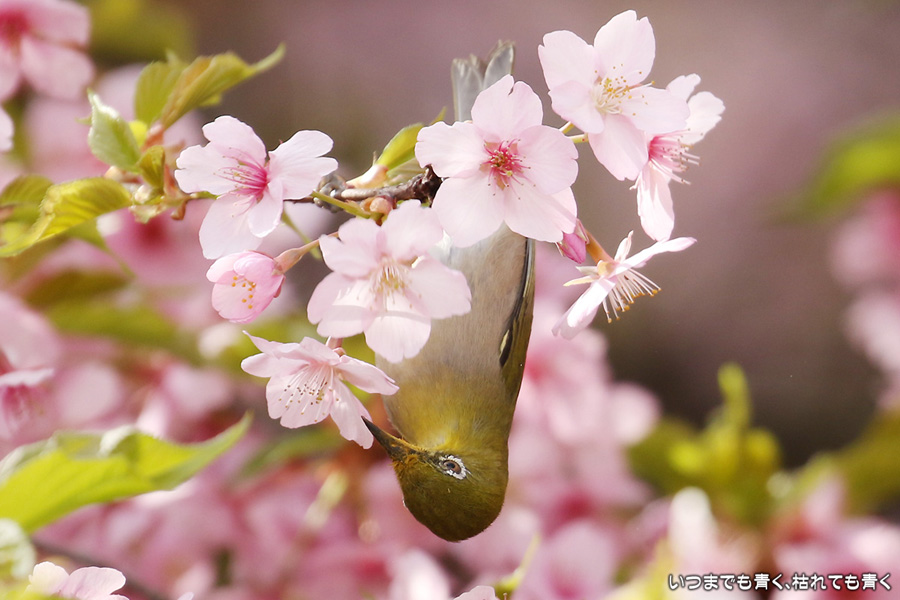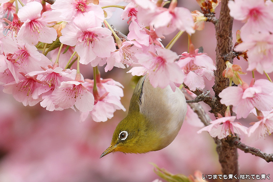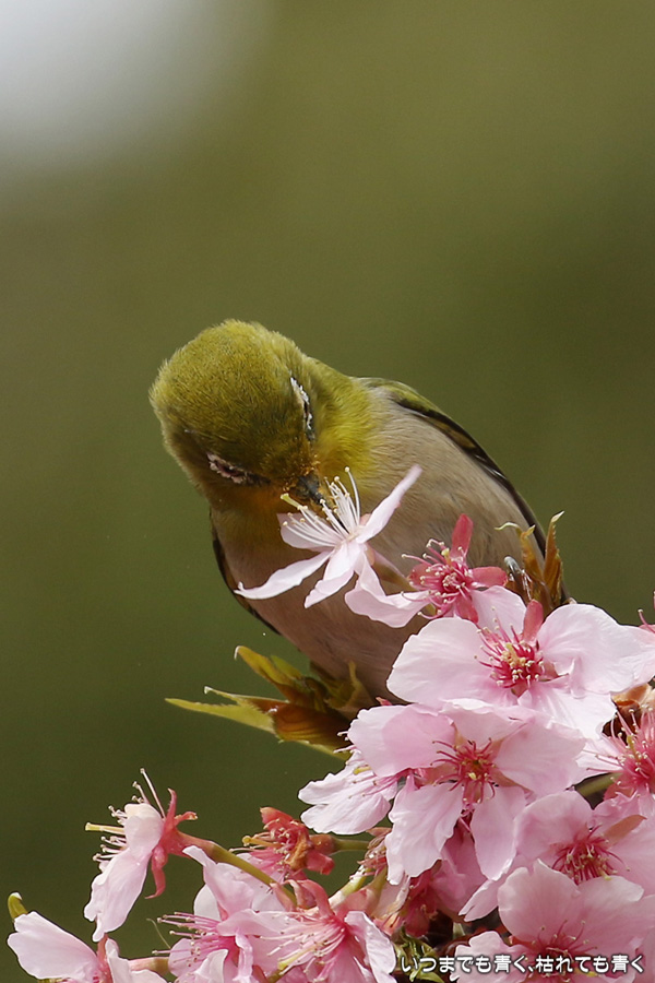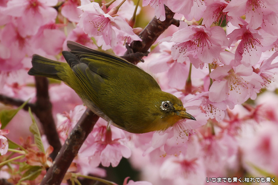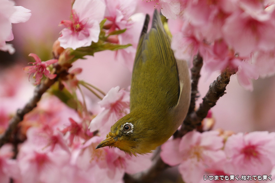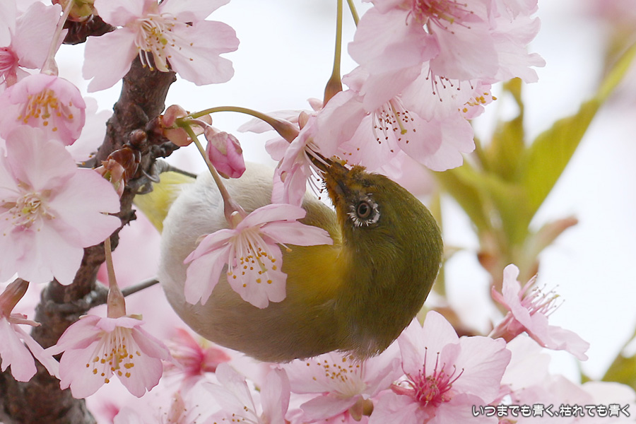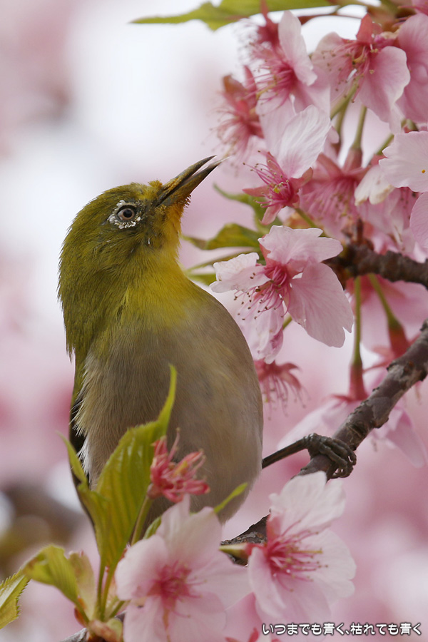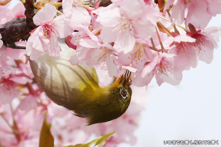 一宮の萬葉公園の河津桜が見ごろで野鳥たちもよく集まっていると聞いて、さっそく行ってきました。見ごろと聞いたのは数日前だったので、河津桜自体は葉が出てきているものもありましたが、メジロは次から次にやってきて撮影に飽きることなく楽しい時間を過ごすことができました。