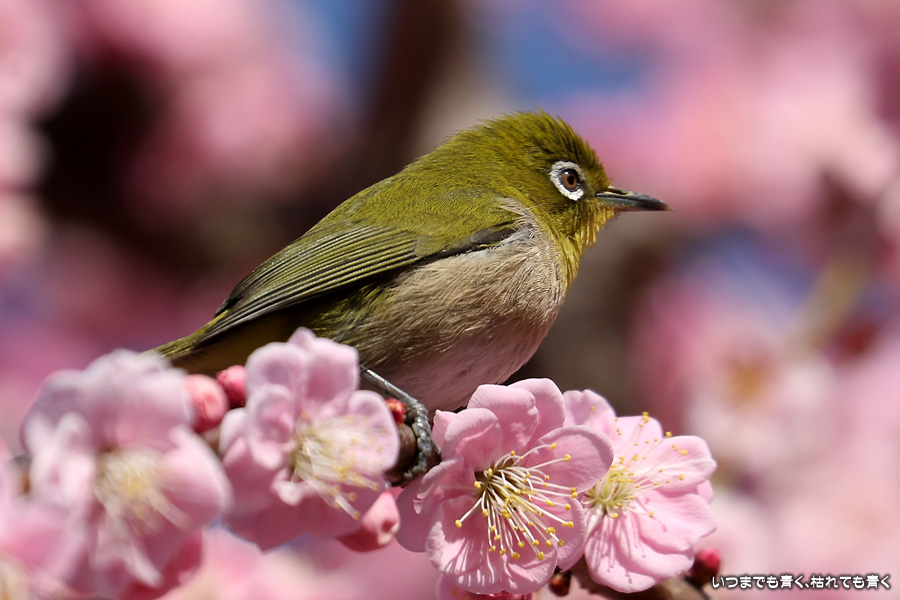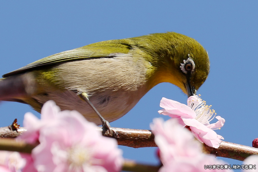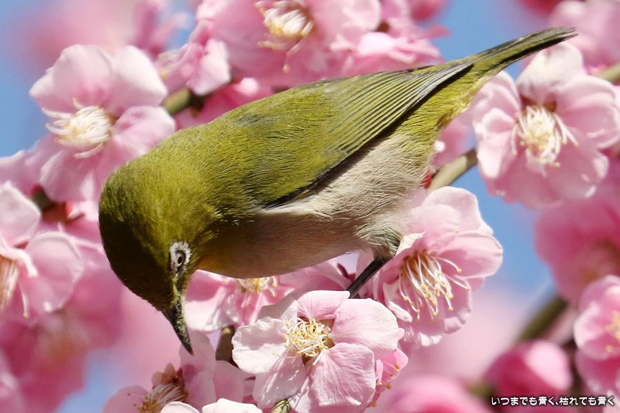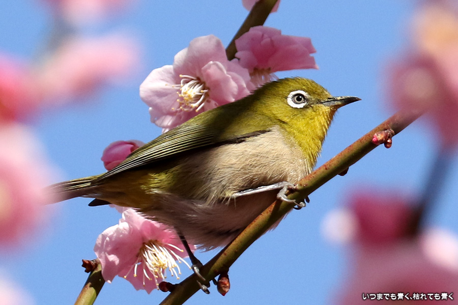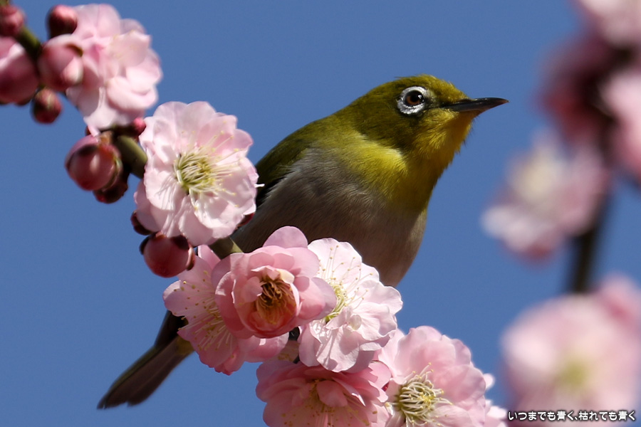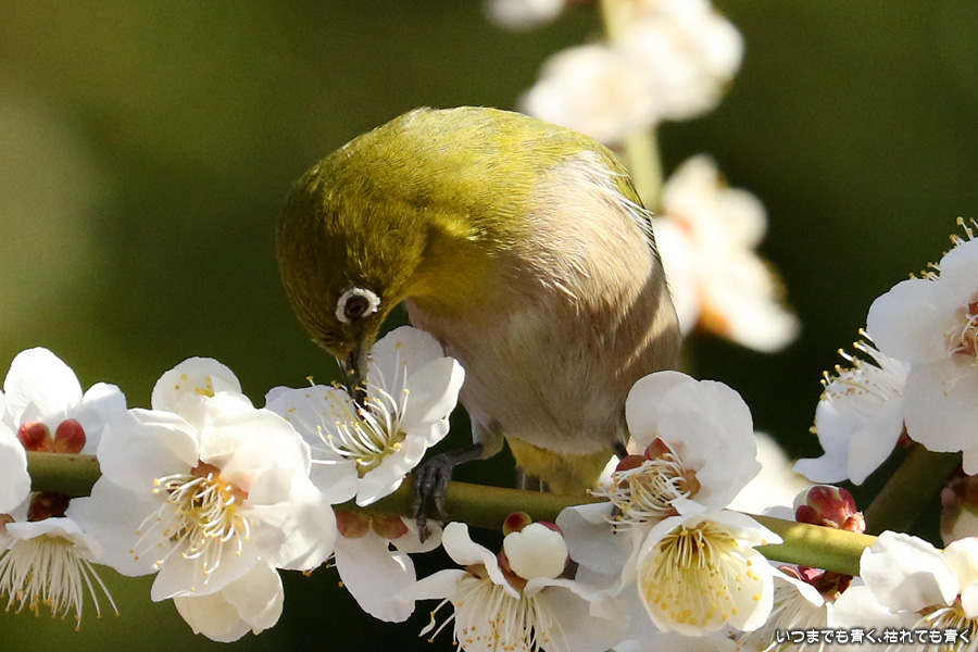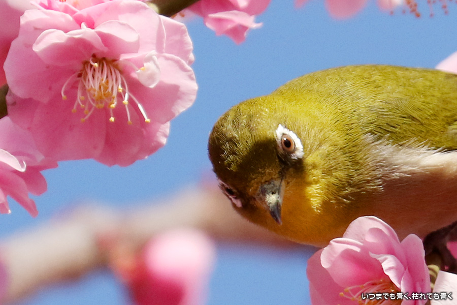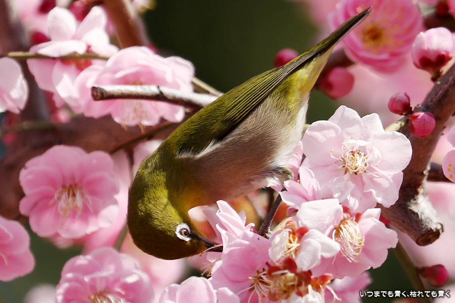 素晴らしい城南宮のしだれ梅にはたくさんのメジロが集っていました。しかし城南宮のメジロ撮影は、しだれ梅の枝が多くて邪魔になったり、花が多いのでメジロの動きが素早かったり、撮る側の人が多くて撮影ポジションを取れなかったり、けっこう難しい撮影でした。