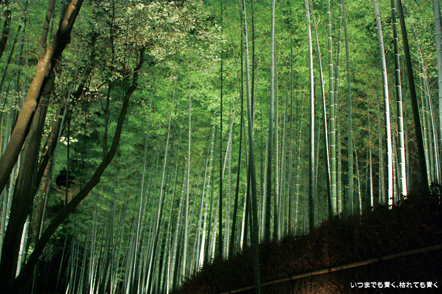 常寂光寺を出て南に進むと、クリスマスのようなライトアップが見えてきます。トロッコ嵐山の駅です。トロッコとJRの線路を跨ぐ道を上を通り、しばらくして左に折れると竹林の小径です。この竹林の小径のライトアップは、とても幻想的ですばらしい光景です。通常のライトの中に青いライトが混じってそれがまた不思議な世界を醸し出しています。この光景は一見の価値あり。来てよかったと思いました。写真は手持ちでのスローシャッター撮影でしたのでピント甘々の写真になってしまいました。