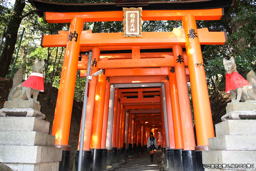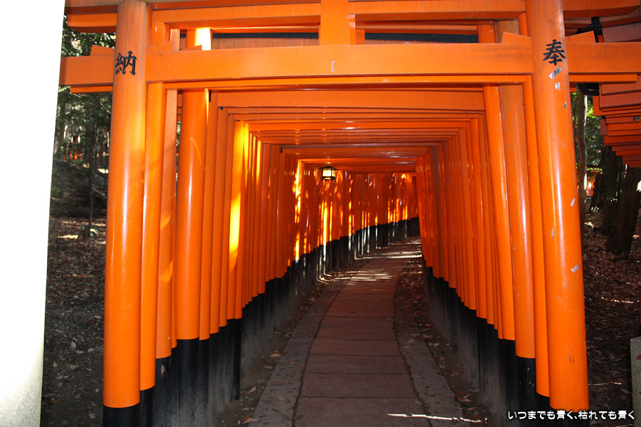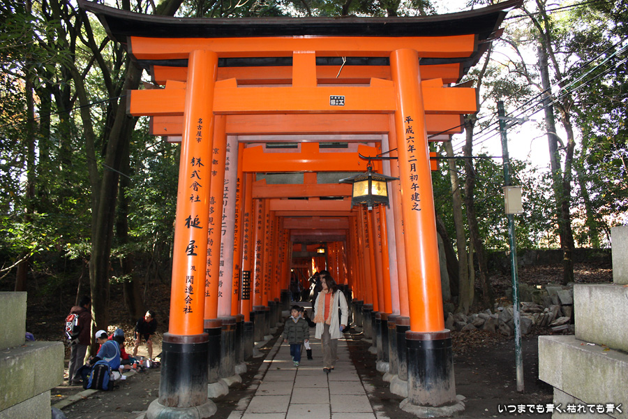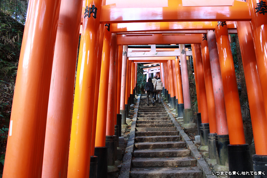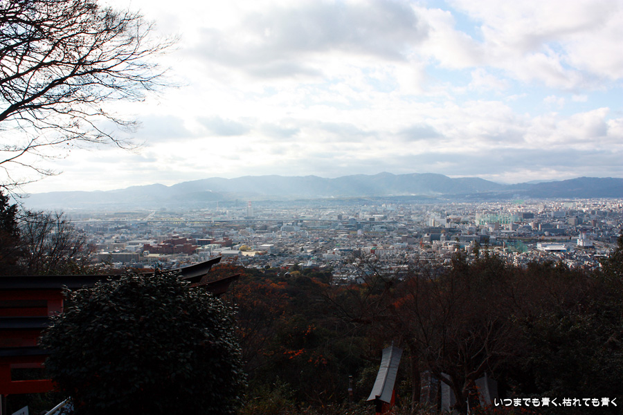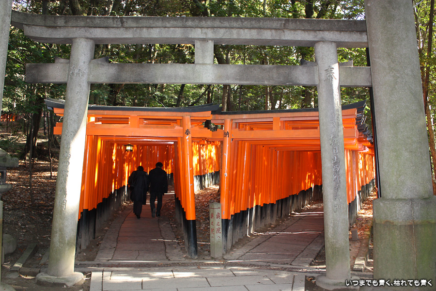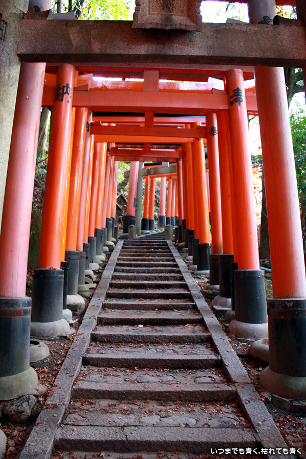 東福寺の次は少し南に下がって伏見稲荷に向かいます。腹ごしらえを御幸道のお店でいなり&うどんの定食を食べてから稲荷山挑戦です。やはりお稲荷さんにはおいなりさんで腹ごしらえです。伏見稲荷の見所は、もちろん朱色の鳥居の続く道。普通ならばあるくのも疲れる山道も、朱色の鳥居をくぐって歩くと、その疲れや単調さも忘れてしまいます。最初の千本鳥居を通ると、奥社奉拝所があり、そこを左に入ると長い傾斜の道が続きます。目標は四ツ辻という京都を見渡せる場所までと決めていたのですが、そこまでもなかなかたどり着きません。でも苦労してたどりついた四ツ辻からの眺めは最高です。さらに奥には一周30分コースがあるのですが、私の今の体力ではここまでが限界でした。すでに足のふくらはぎは痛くて帰りの階段を降りる時には足の膝が震える始末。久しぶりにいい運動になりました。
