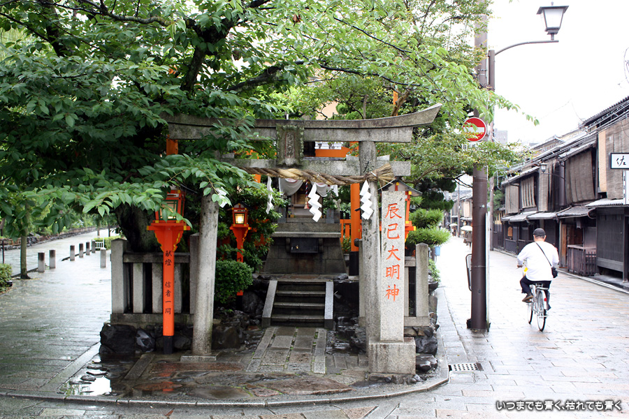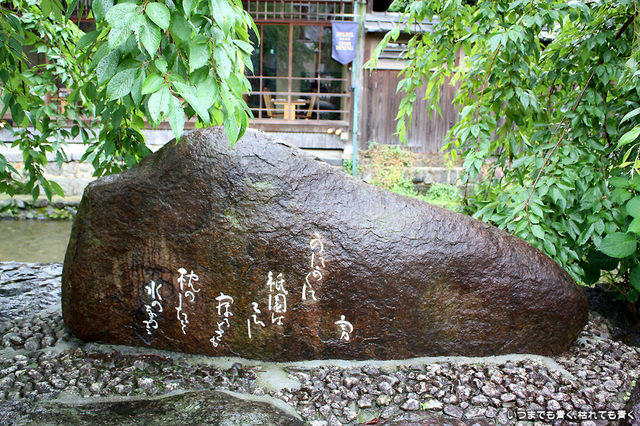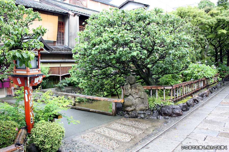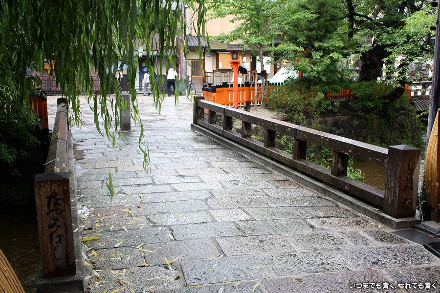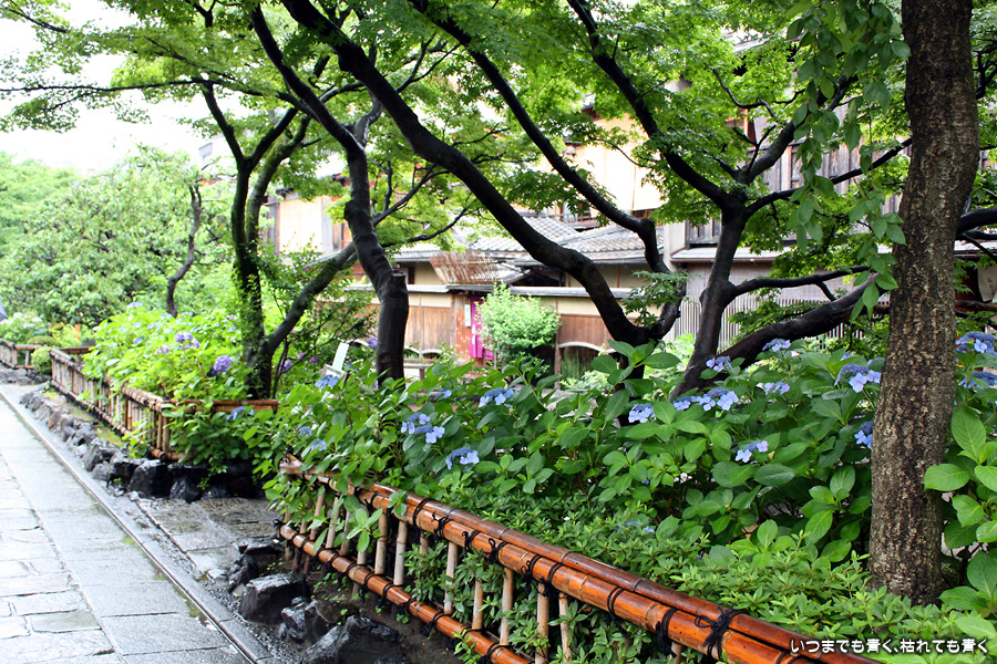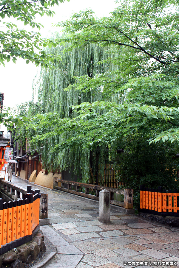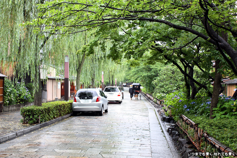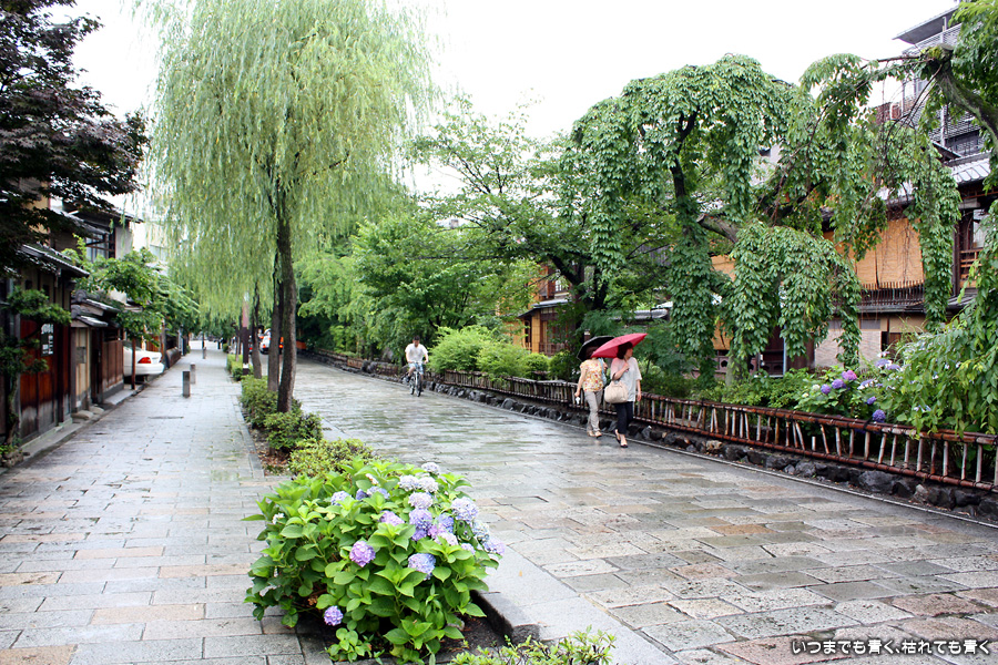 あいにくの雨です。そんなにひどい降りではありませんが傘は手放せない天気で少し残念ですが、かなりの距離を歩くつもりでしたので、日差しが強いよりはいいかと良いほうに考えることにします。スタートは、白川にかかる大和大路通の大和橋。そこから白川南通を白川沿いに行者橋のあるところまで歩くことにします。巽橋や辰巳大明神の付近は、いつ来ても落ち着く場所です。ここは毎回来ていますが、明るい時間に来たのは初めてなので新鮮な気持ちで楽しめました。白川沿いには柳が長い葉を垂らし、道端には紫陽花が美しい花を咲かせていて、雨の季節にぴったりの風情です。濡れて光る石畳にも落ち着きを感じます。このあたりは何もかも大好きです。
