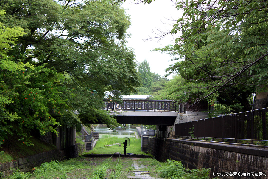次の目的地は蹴上インクラインです。移動は白川沿いを北に歩き、地下鉄で東山駅から蹴上駅へ移動です。インクラインとは、琵琶湖疎水を利用して琵琶湖と淀川間を船で結んでいた時に、船を乗り降りすることなく坂を昇降させるために作られたケーブルカーのようなものです。レール上の台車に船を乗せて巣力発電で得た電力でウィンチするしくみです。インクラインは春には両側に桜が咲いてとても綺麗な場所なのですが、この時期、しかも雨の中で歩くというのは私のような物好きだけのようです。足を置く枕木を選んで下を向いて黙々と歩いていると、クルマの走る音が突然消えて目の前に台車に乗った船が現れました。蹴上舟留です。その時代にタイムスリップするんじゃないかと思えるような、独特の雰囲気を味わうことができました。近くには蹴上義経地蔵(最後の写真)がありました。源義経が奥州に向かう時にここで平家の一団に泥水を蹴り上げられたためにその一団を切り殺したために、村人がそれを弔うために石仏を安置したものです。周りは疎水公園となっており、緑のこけの木々がとても幻想的でした。あとで調べてわかったことですがもう少し南に行くと日向大神宮があるようです。いつか機会があれば訪れたいと思います。