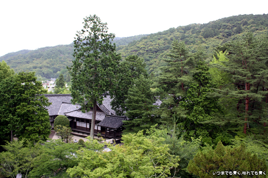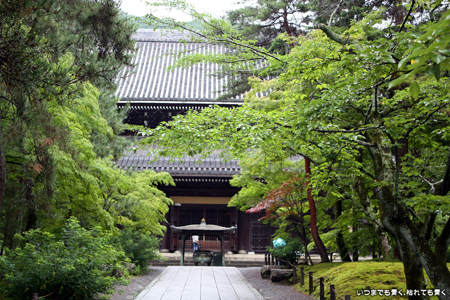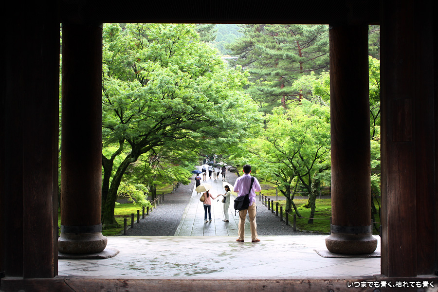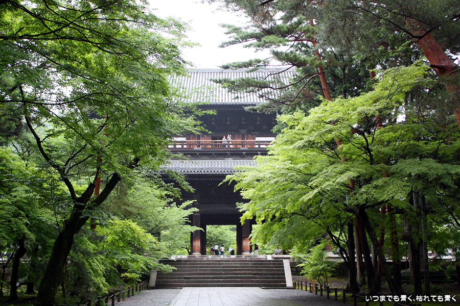 インクラインを楽しんだあとは南禅寺に向かいます。南禅寺には、疎水公園の入り口から金地院の前を通って三門前に出る小路を歩いていきます。これもあとで知ったのですが、疎水公園の上の疎水沿いの道を行けば、水路閣に続く水路を上から眺めながら南禅寺まで行く事ができたそうです。次回は絶対のそのルートを歩いてみたいと思います。南禅寺では、水路閣の下で写真を撮ってドラマのシーンと重ね合わせて楽しんでいましたが、アーチが何重にも連なる構図での撮影を忘れてしまいました。中途半端なアーチの重なりの写真は撮ったのですが、上流側の端から下流側を眺める一番いい構図を撮影しないで帰ってきました。今回は雨を避けたり、カメラのレンズを気にしたりということで焦って、現地での的確な判断がかなり鈍っていたように思います。水路閣を撮影したあとは、2年前に来た時を思い出して三門でのんびりと新緑の山を眺めて心を癒しました。三門拝観時間の17時を過ぎてしまい、途中で三門を追い出されてしまったのは残念でしたけど、これは仕方ありません。