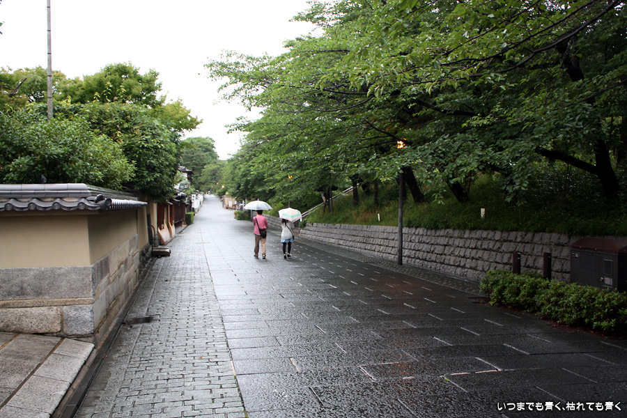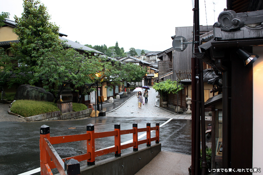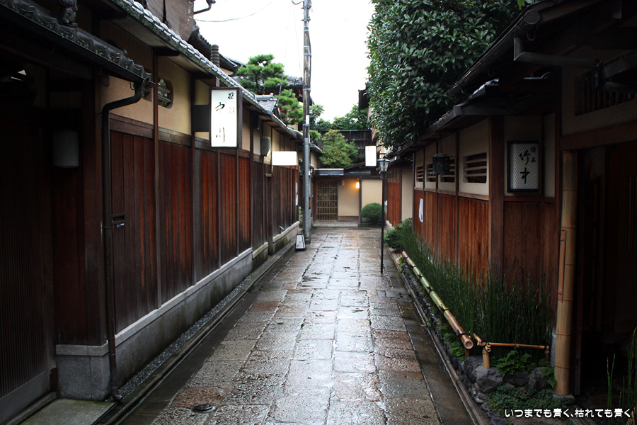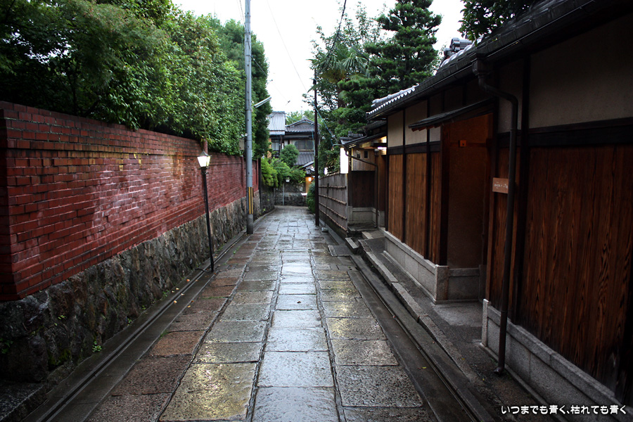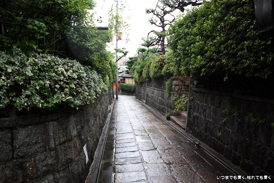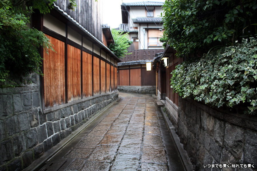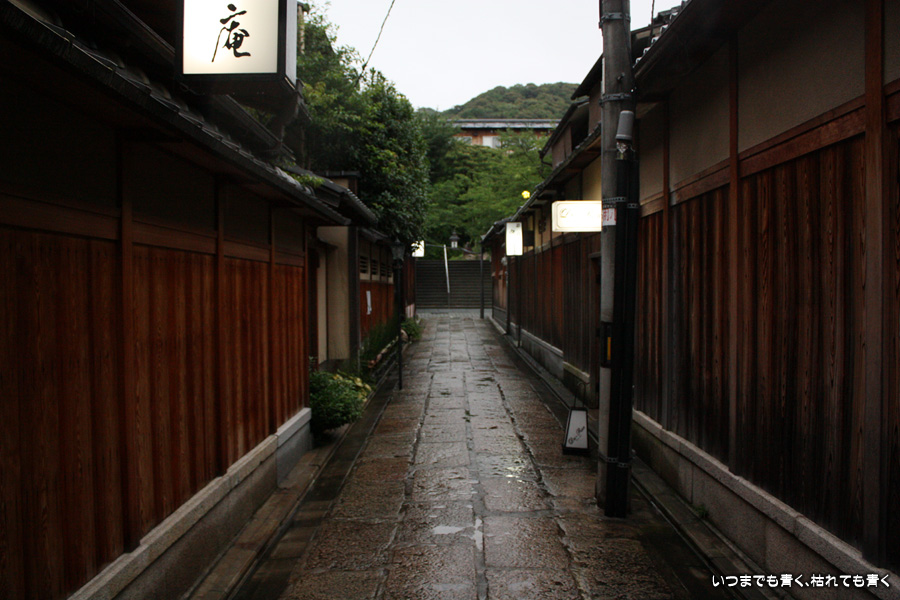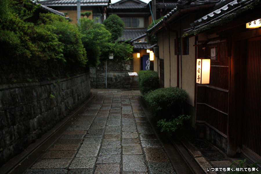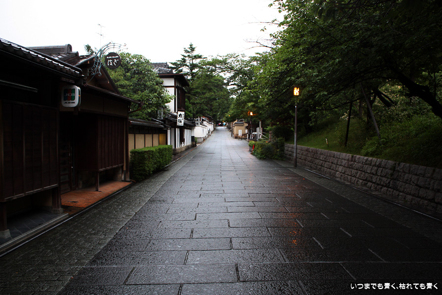ねねの道は、ねねのゆかりのお寺である高台寺の横の落ち着いた感じの幅の広い道です。少し歩くと左に石塀小路への入り口があります。そこに入るとまた雰囲気が一変して、京都の秘密の隠れ家に来たような楽しさを感じます。こういう小路を歩くのも京都の楽しみです。雨も降っており、19時をまわろうとしている時間になっていましたので、実際はもっと薄暗い感じでした。