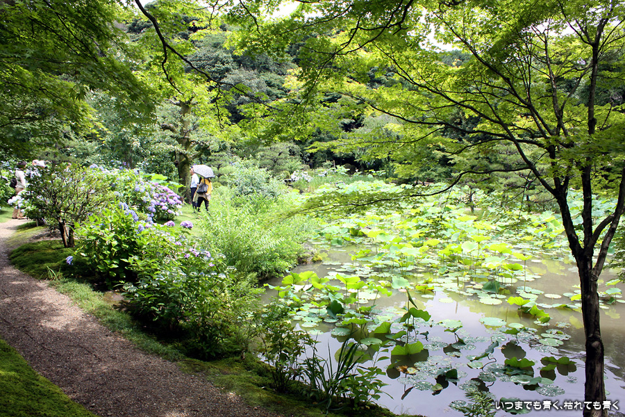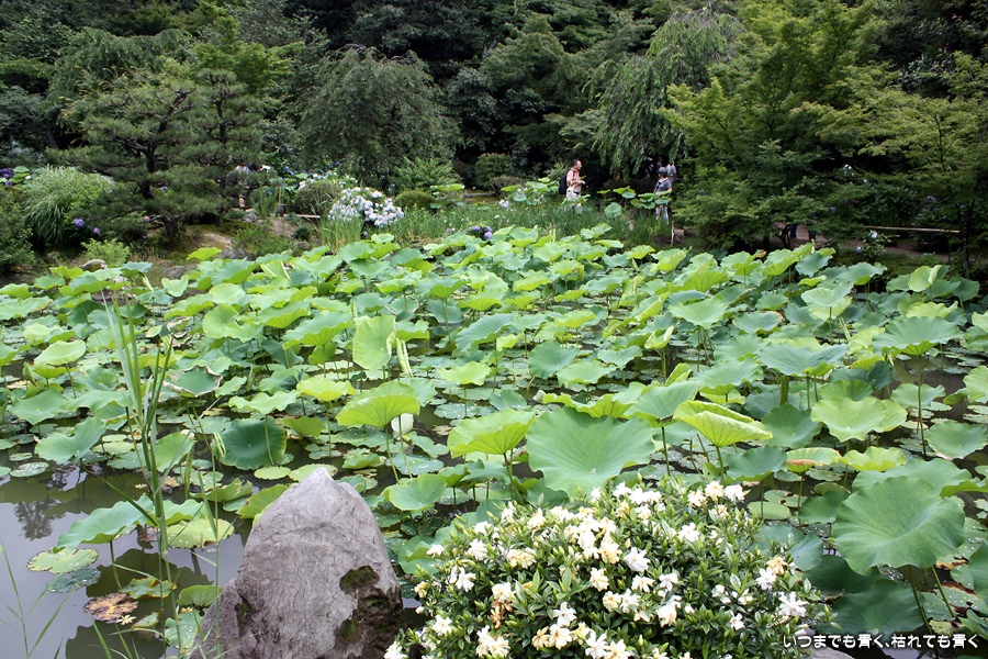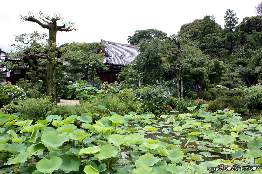 「活動寫眞の女」という小説で知った待賢門院ゆかりのお寺です。拝観料を払って中にはいると、鉢に植えられたたくさんの蓮と、その背景には色とりどりの紫陽花が目に飛び込んできます。奥には池があって、その水面一面には蓮の葉が覆っています。残念ながら少し時期が早くて、極楽浄土の光景は見ることができませんでしたが、蓮や紫陽花を歩きながら眺めているだけで心落ち着くいい場所です。ここには、待賢門院璋子に使えていた女房の待賢門院堀河の和歌「長からむ 心も知らず 黒髪の 乱れて今朝は ものをこそ思へ」の歌碑もありました。百人一首80番の歌で、恋人との情事のあと、恋人の心を計りかねて乱れた黒髪のように心乱れて思い悩んでしまうという歌です。待賢門院璋子もなかなか艶やかな女性ですが、待賢門院堀河も過激な歌を詠むものです。意味を知ると、この歌碑もなんとなく身近に感じられる気がするのは私だけでしょうか。
