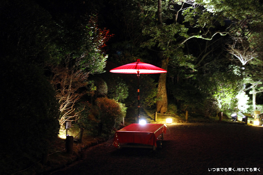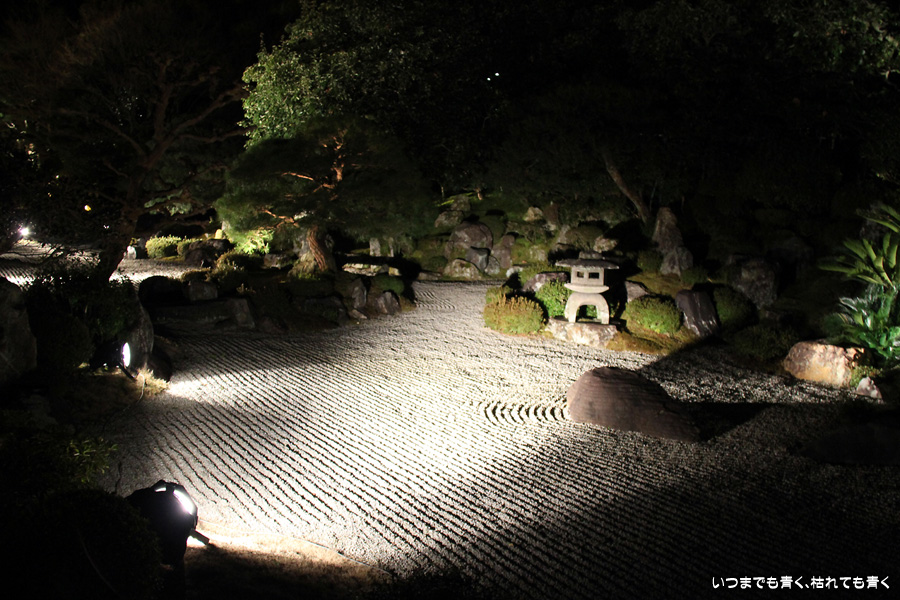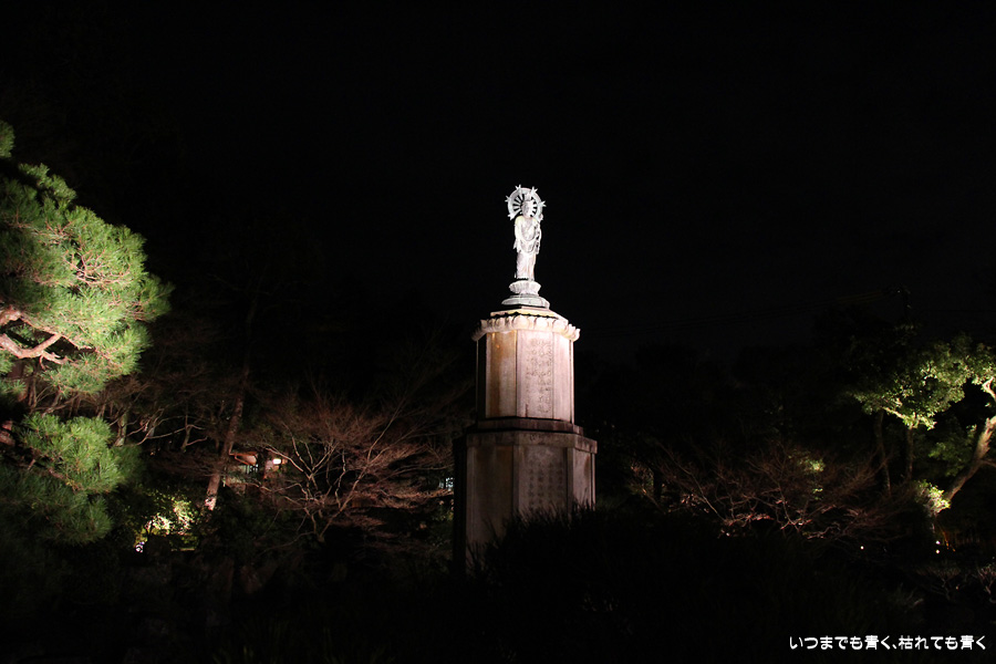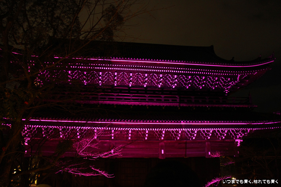 次は知恩院の三門に映し出される「幻想の灯り」を見に行きました。しかし、知恩院の三門前に着きましたが何も映っていません。三門の前にいたスタッフらしき女性に聞いてみると、三門の裏でやっているとのこと。脇の道から境内に入っていくと、やっていました。大きな三門をスクリーンにして、いろいろな光のアートを映し出していました。石段に座って巨大スクリーンを鑑賞するのはなかなか楽しかったです。ただ、花灯路が21時半までなのに対して、すでにこの時点で時刻は21時を過ぎており、「幻想の灯り」を楽しむのもそこそこにして、急いで知恩院の友禅苑に入りました。暗い中で一部がライトアップされた庭園は幻想的でしたが、ちょっと消化不良。ここは明るいときに楽しむ庭園かなという感じでした。
