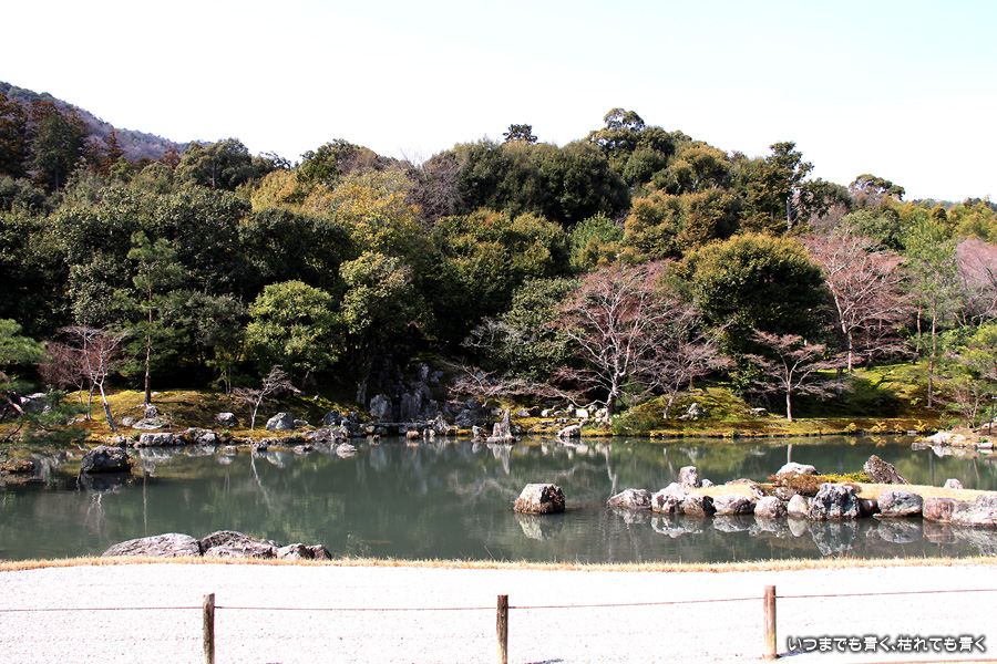 二日目は、嵐山の「ジオラマ京都JAPAN」に行くつもりでいたのですが、夜にネットで調べたら3月16日までメインテナンスのために休館とのことでしたので、同じ嵐山の天龍寺を拝観しました。天龍寺は、後醍醐天皇の菩提を弔うために足利尊氏を開基として開かれたお寺です。門をくぐってから庫裏に着くまでの距離がかなりあって、広大な土地を要していることを実感します。庫裏で拝観料を払って方丈を見学します。方丈の廊下の木の段差に座って曹源池庭園を眺めていると、ずっとこのままゆっくりと流れる贅沢な時間を過ごしたいと思ってしまいます。方丈を出て実際に曹源池庭園の中に入ることもできます。今は椿、梅、馬酔木くらいしかありませんが、曙馬酔木の花がとても可愛らしかったです。馬酔木はさだまさしの「まほろば」で若い頃に知った木ですが、実際の出会いが最近で、とても親近感を感じる木です。曹源池庭園の奥にある後醍醐天皇の尊像を祀る多宝殿から先は、百花苑という庭園となっています。ここも、今の季節は梅と南天くらいしか色鮮やかなものはありませんが、きれいに整備されていて、それぞれの花の見頃の時期には素晴らしい華やかさを誇る庭園だと感じます。