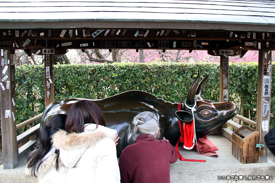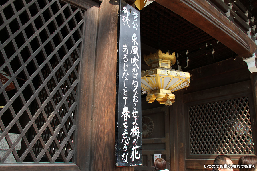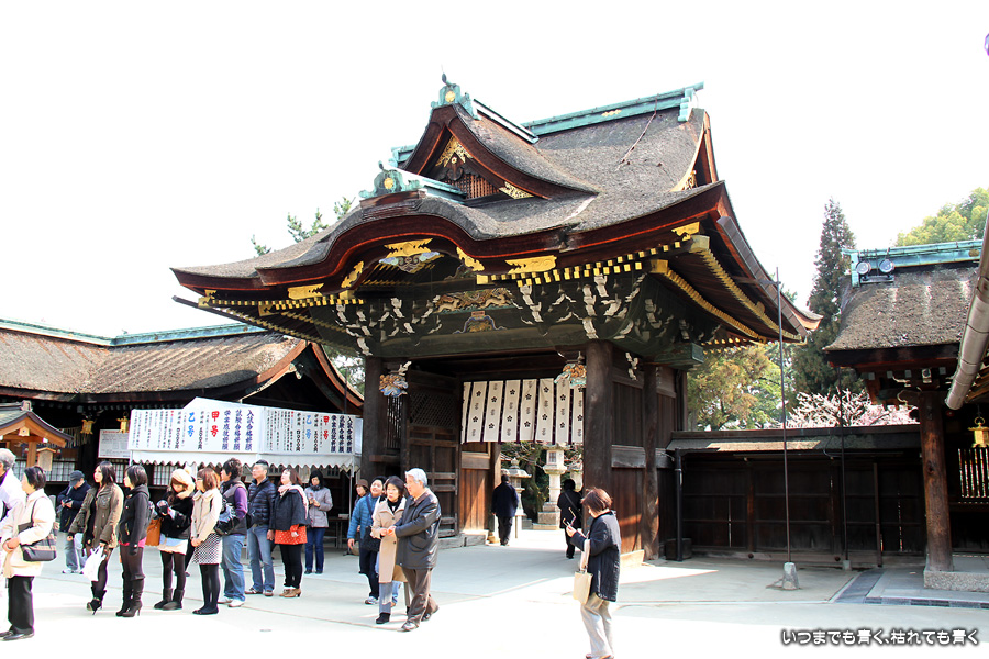 北野天満宮は、菅原道真をお祀りした神社の宗祀です。いうまでもなく学業成就の神様で、今回もたくさんの若い人が連なってお参りをしていました。菅原道真が藤原氏の陰謀により大宰府に流される時、「東風吹かば匂ひおこせよ梅の花 あるじなしとて春なわすれそ」と詠いかけた北野天満宮の梅が、道真を慕って大宰府の菅原道真のもとに一夜で飛んでいったという「飛梅伝説」が有名ですが、私はその飛梅伝説をモチーフにしたさだまさしの「飛梅」という曲が大好きなので、そういう意味でも自分が北野天満宮にいるということが感動でした。