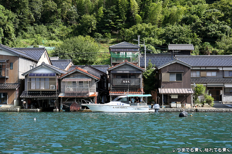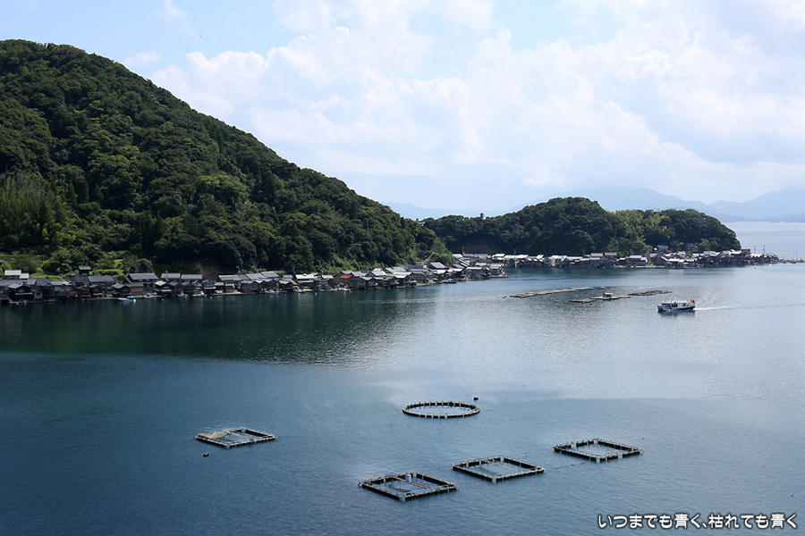 今回の旅でどうしても見たかった風景のひとつ、伊根の舟屋です。これだけの数の舟屋が並んでいる光景はここだけ。そのために、いろんなドラマのロケ地になった場所でもあります。奥の方まで舟屋が美しく連なっていて見ごたえがありますが、それを見るためには船が必須で、駐車場の近くにいろんな船の連絡先が書いてあります。今回は遊覧船ではなく海上タクシーを選んで頼みましたが、説明も楽しくて、要望にこたえて臨機応変に回ってくれてとても楽しめました。