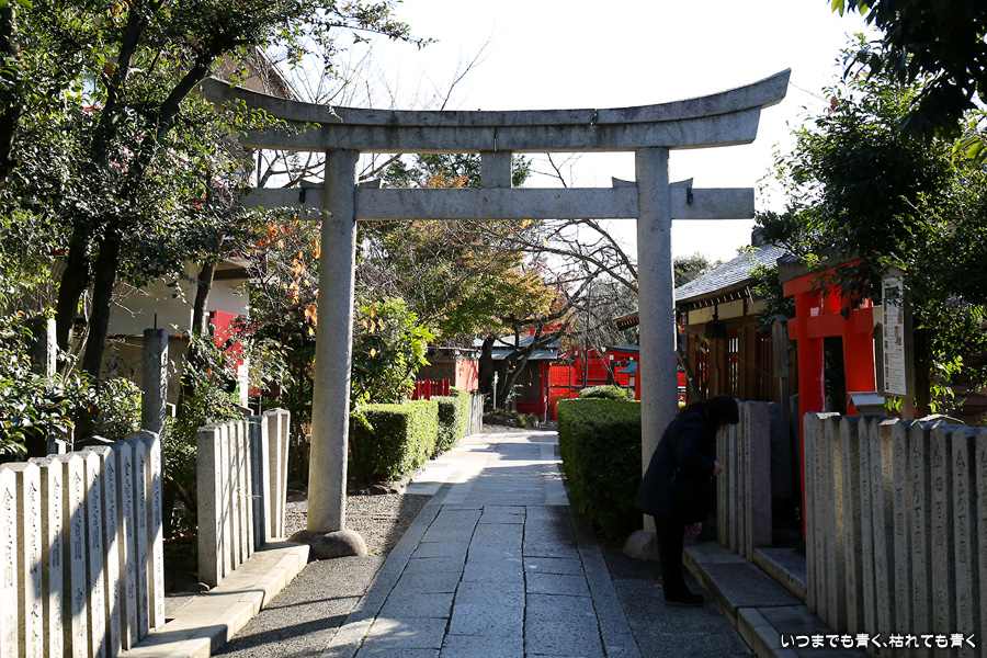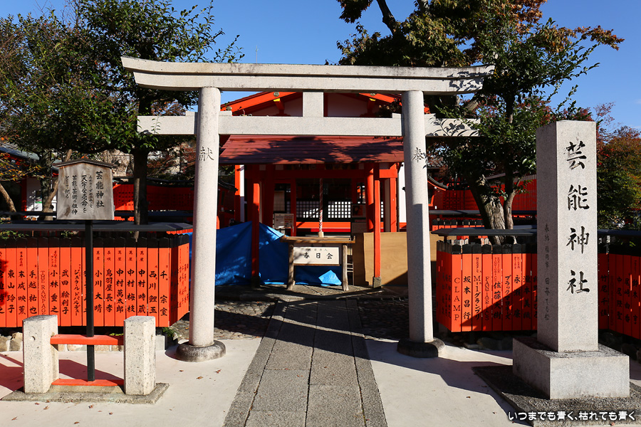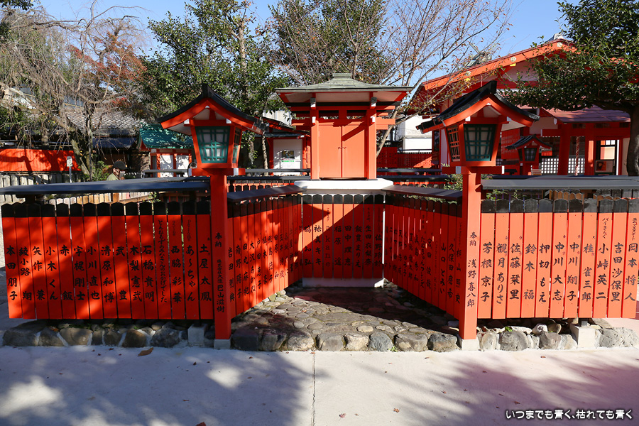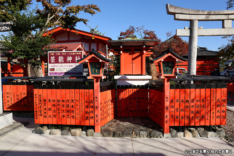 鹿王院の紅葉を見た後に歩いてやってきました。車折神社も今回は初めての参拝となります。車折神社には15の末社がありますが、その中でも最も有名なのは芸能神社です。有名人の名前が書かれた朱色の奉納板がずらりと並んでいるのが壮観です。紅葉は散ってしまっていたり青かったりしてあまりきれいではなかったので、紅葉の写真は諦めることにしました。帰りは車折神社の真ん前の駅から嵐電で嵐山まで戻りました。