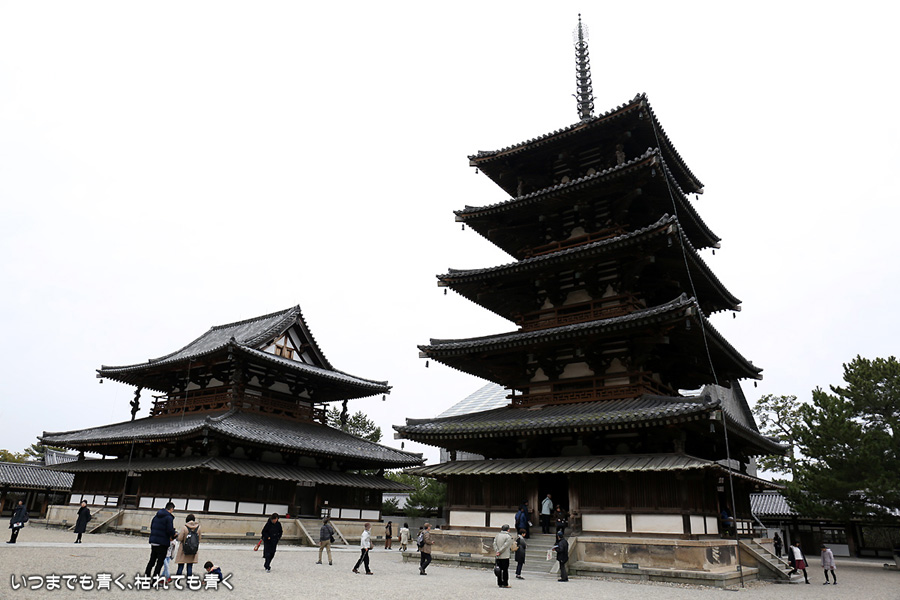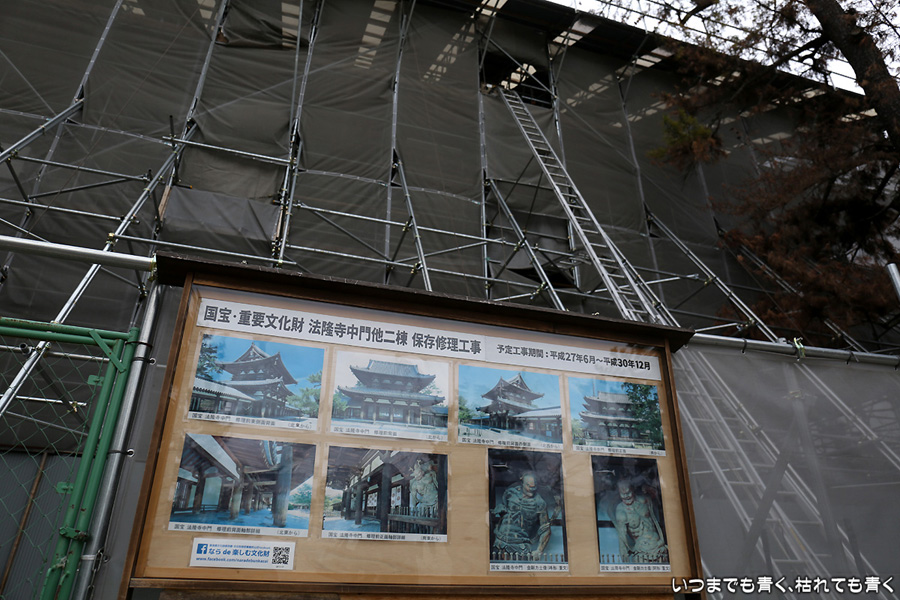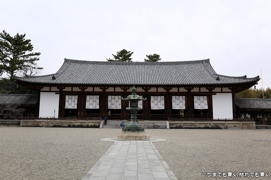 今回の東大寺修二会&奈良世界遺産巡りの旅の最後の訪問地となります。ここも中門が保存修理工事中(平成30年末まで)です。金剛力士像を見ることができないのと、外からの五重塔と金堂撮影時の景観がちょっと残念でした。このお寺は人や時代が聖徳太子の頃、飛鳥時代に変わっても違和感が感じられない雰囲気を維持していて、歴史を強く感じさせてくれます。大宝蔵院の展示物は、貴重なものを常時公開されていて満足感を高めてくれます。拝観料は西院伽藍(金堂・五重塔等)、大宝蔵院、東院伽藍(夢殿等)あわせて1,500円ですが、十分に納得できます。