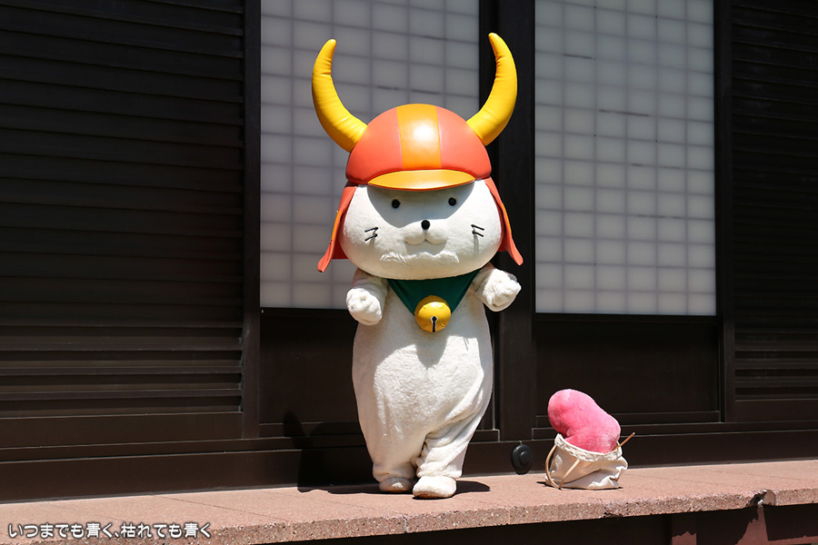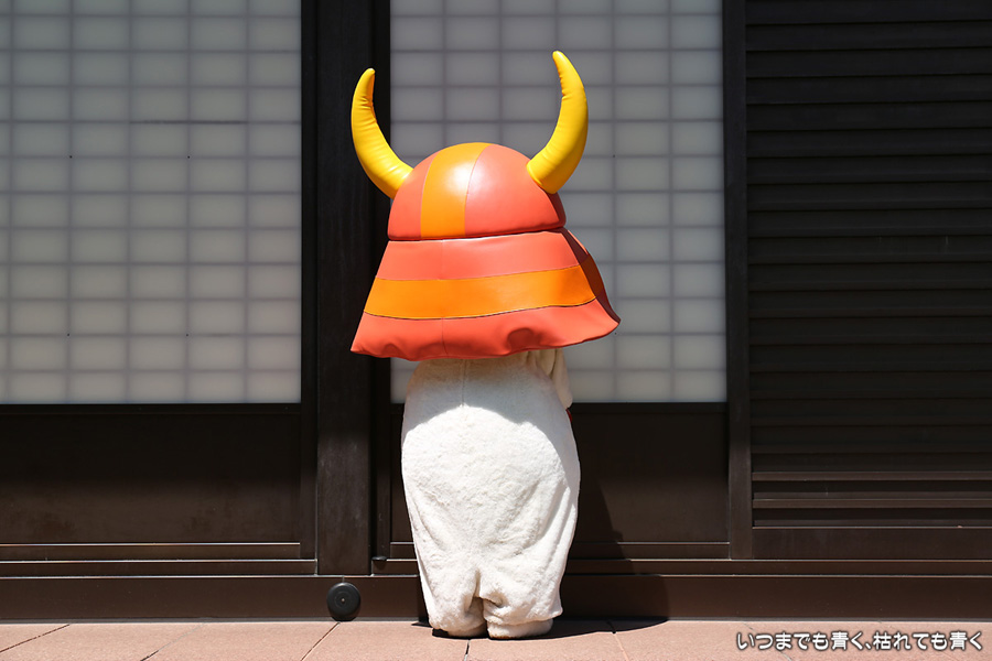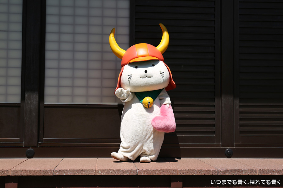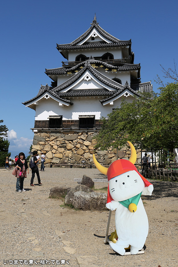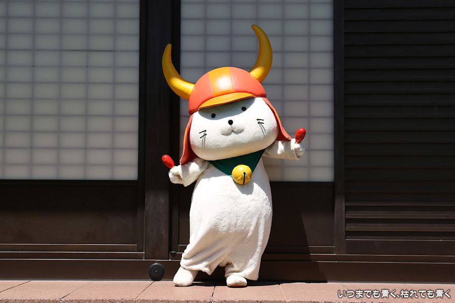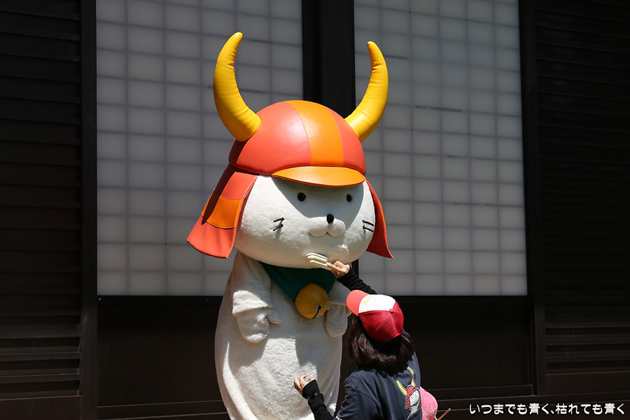 彦根城は、私がクルマの免許をとったころ、両親を乗せてドライブに来たことがある場所です。小雨の中、時期でもない梅園を歩いた記憶がありますが、今となってはその記憶も正しいかどうか怪しいです。天守の残っている12城のうち、国宝は、松本城、犬山城、姫路城、松江城、そして彦根城の5城です。その中で訪れた記憶のあるのは、松本城、姫路城、そして今回の彦根城だけです。犬山城は近いにもかかわらず訪れたことはありません。彦根城は、本当に美しい城です。近くで見るとその美しさがよりよくわかります。彦根城は関ケ原のあと、石田三成の佐和山城を一掃するために家康の命により建てられた城で、当初は違う場所に建てる予定だったそうですが、井伊直政から直継の代になって、現在の位置になったと言われています。歴史は、本や教科書だけでは頭にはいらなくて、歴史の場所に来て、何がここであったかを思いめぐらせて初めて断片的な知識が糸になるような気がします。天守から見える小さな山も、あれが佐和山だとわかると、特別な山に見えてくるので不思議なものです。さて、彦根といえば、ひこにゃんですね。イラストよりも実物のほうがずっとかわいいです。動きが本当にゆるゆる。音楽も無くひこにゃんがゆっくりと動くだけなのですが、それがなんとも癒されます。暑い中、お疲れ様です。ちなみにひこにゃんは、ゲート前の博物館表御殿に登場するので、彦根城観覧料無しに見ることができます。その写真を最後に付けておきます。