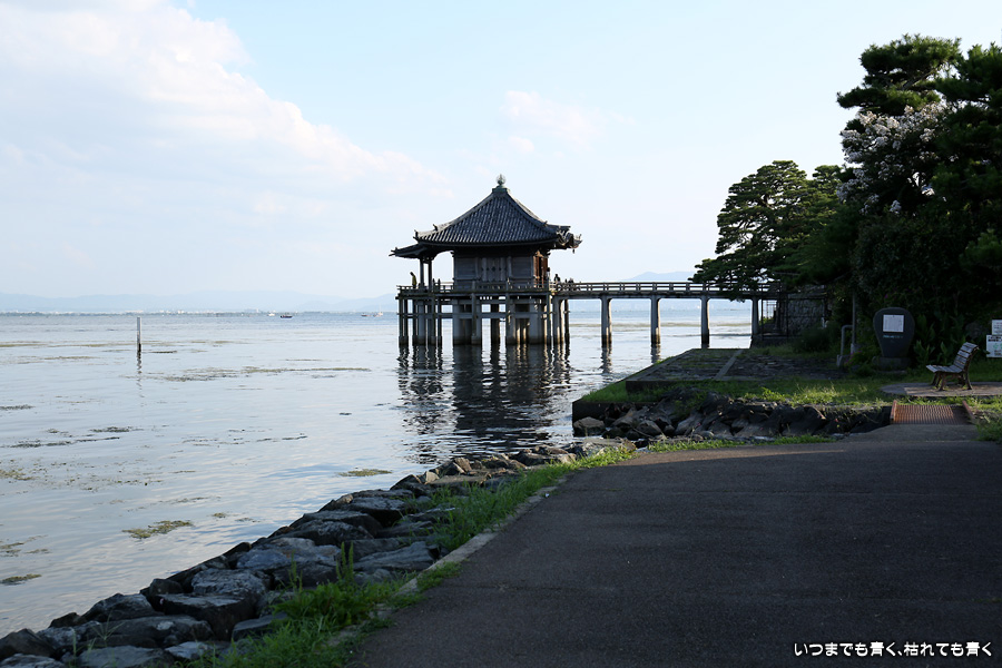 一週間前に来た浮御堂の北側からの写真を撮りたくて今週あらためてやってきました。ここで2時間サスペンスドラマでは最後の謎解きをしたりするシーンに使われます。ここは浮御堂の境内ではなく普通の湖畔道なので、拝観とは関係なく立ち寄って眺めることができます。ロケ地好きにはたまらない場所です。
