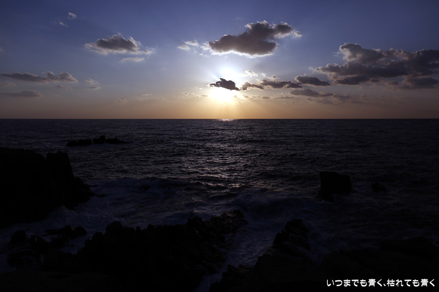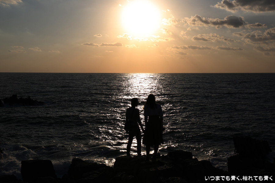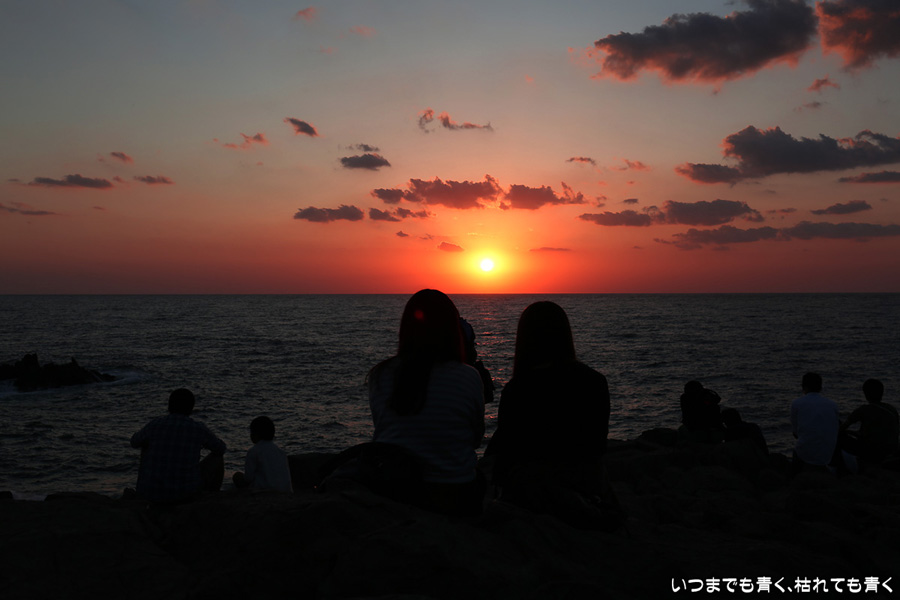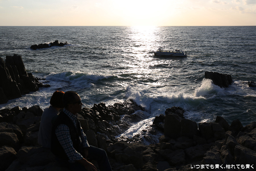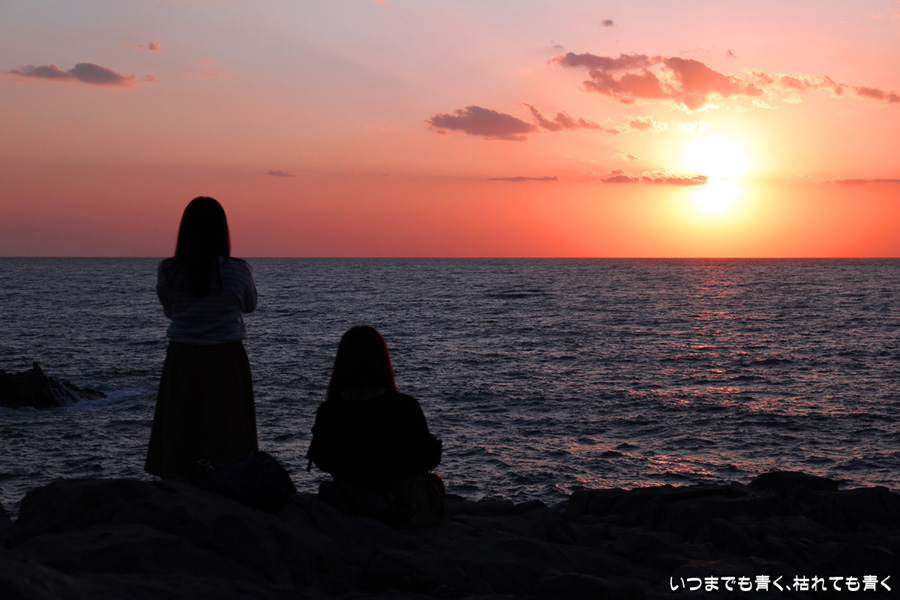 東尋坊では波が岩に打ちつけてちょっと荒々しい感じです。波が岩にあたって砕け散るさまを眺めているだけで、心は逆に落ち着いていくような気がします。落ちると危ないので端っこの方には行かないようにしていましたが、以前の心が病んでいた時にあった飛び込みたくなる衝動もなくて、のんびりと楽しむことができました。そうこうしているうちに、日本海に太陽が沈み始めて、あっという間にすべて見えなくなりました。沈んでいく夕日を見たのなんていつ以来でしょうか。天候にも恵まれ、贅沢なひとときでした。