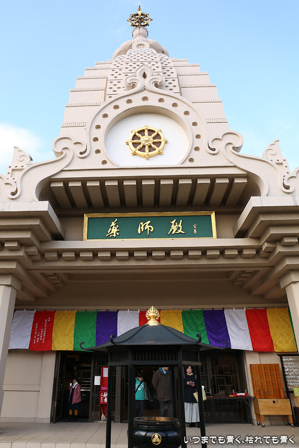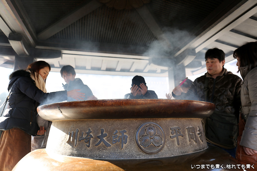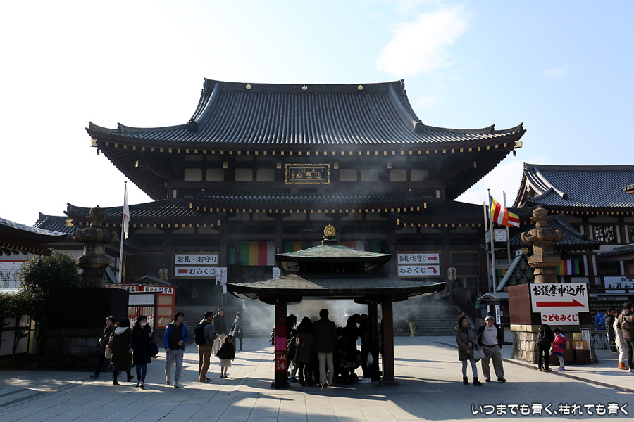 関東の友人が定年退職のお祝いをしてくれるというので、それに出かけたついでに川崎大師に参拝してきました。仲見世通りは人が多くて、飴を切る音と相まって賑やかです。不動堂の前には露店も並んでいます。北の湖の銅像があったらしいのですが、残念ながら見逃してしまいました。川崎大師の正式名は、真言宗智山派大本山金剛山金乗院平間寺、厄除け大師として知られる寺院です。